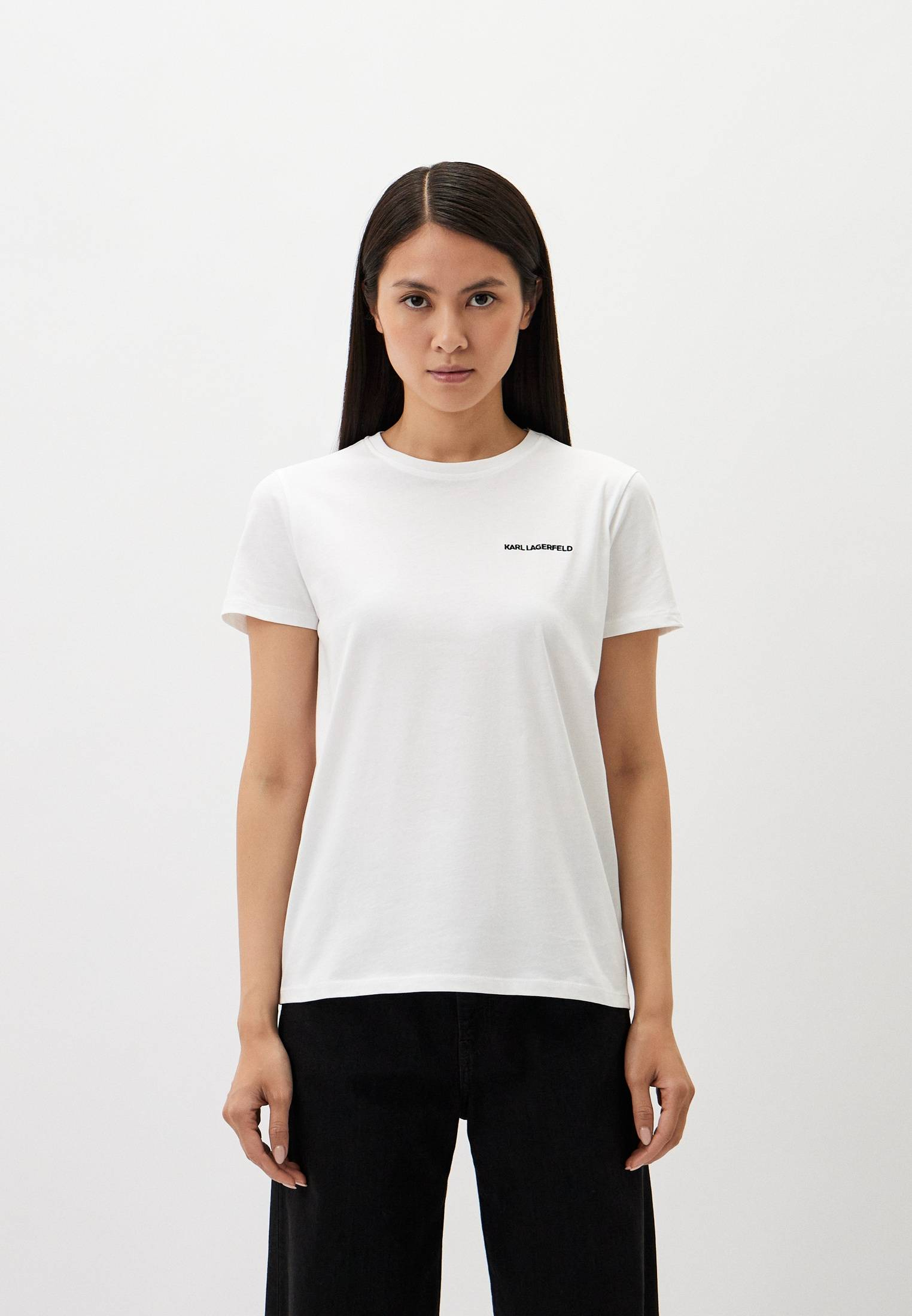 - Женская футболка, выполненная из органического хлопка, обеспечивает комфорт и легкость. Модель изготовлена в рамках кампании Karl Cares, что означает использование более устойчивых материалов и экологичных методов производства. Футболка прямого кроя с классическим круглым вырезом оснащена контрастными минималистичными нашивками с логотипом на груди и спине.