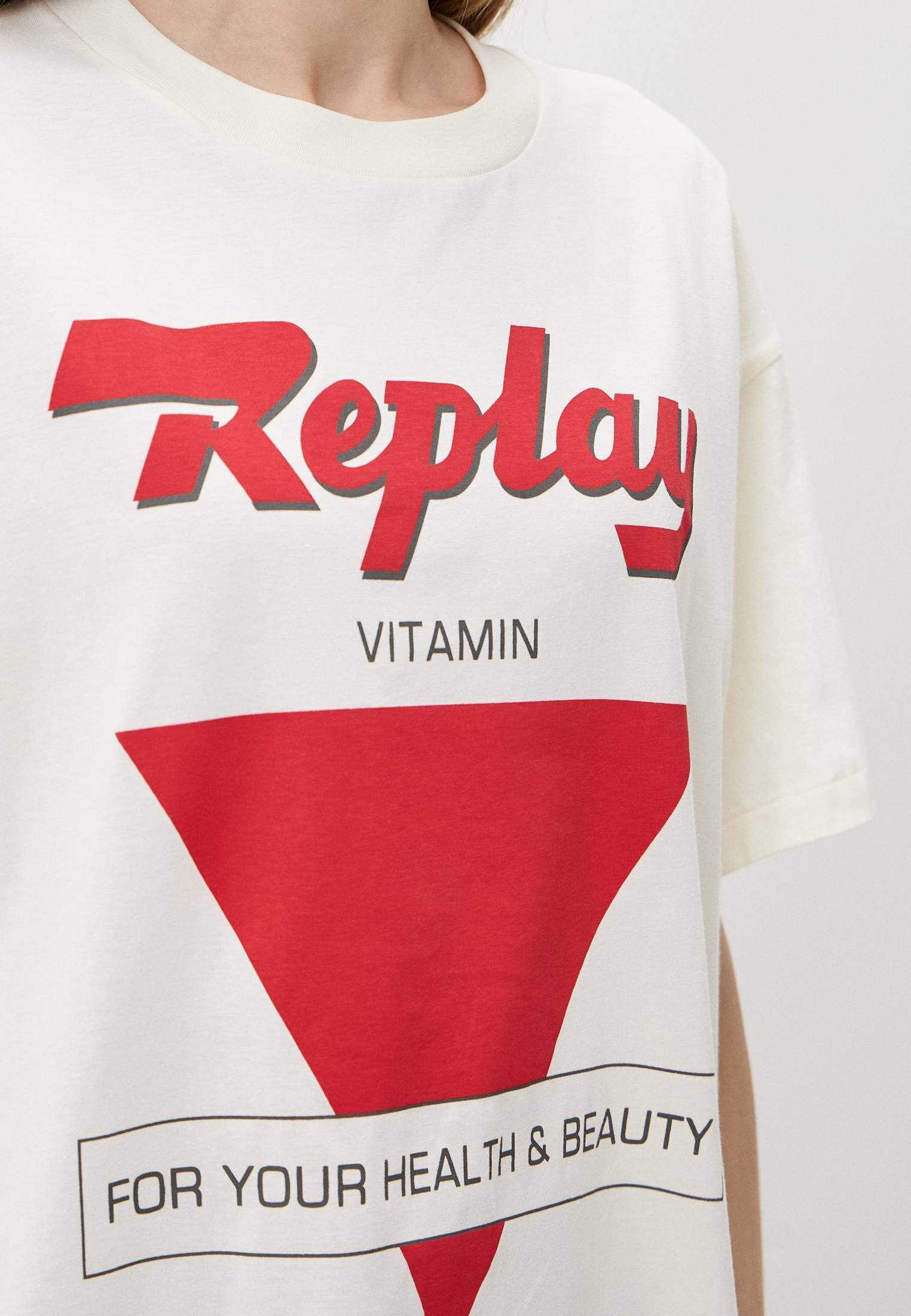 - Для истинных ценителей оверсайза — повседневная футболка свободного кроя на каждый день! Эта молочная оверсайз-футболка Replay с круглым вырезом горловины и спущенной линией плеч выполнена из мягкого хлопкового трикотажа и украшена крупным ярким принтом в стиле Replay. Изделие будет прекрасно сочетаться с широкими или зауженными джинсами, брюками, кроссовками и кедами из широкого ассортимента BNS Club.
