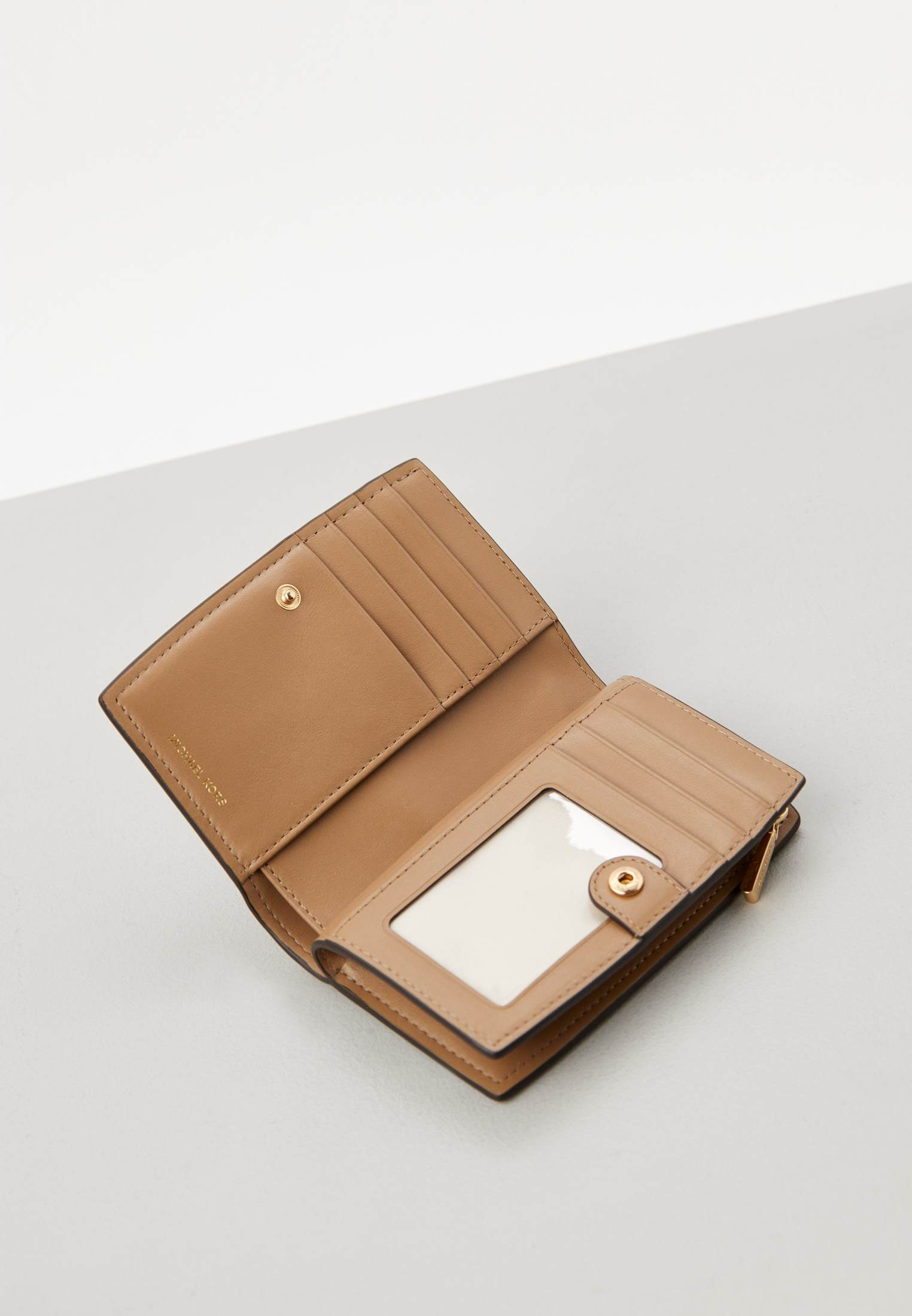 - Кошелек Michael Kors поместится в любой сумке и станет незаменимым аксессуаром на каждый день. Изделие выполнено из натуральной зернистой кожи. Кошелек застегивается на кнопку, внутри имеет отделения для купюр и мелочи, а также множество слотов для карт. В оформлении модели использован фирменный золотистый логотип Michael Kors.