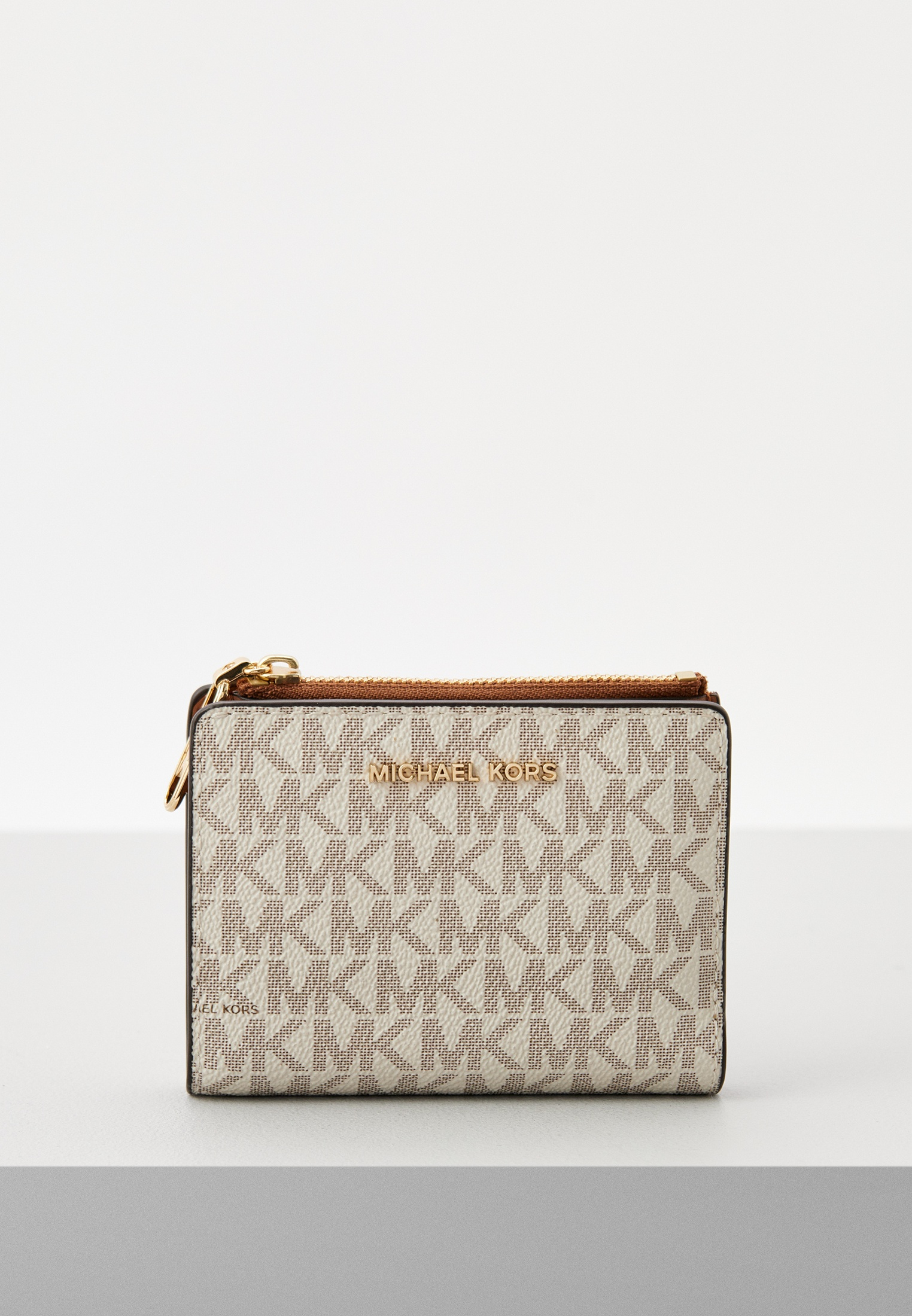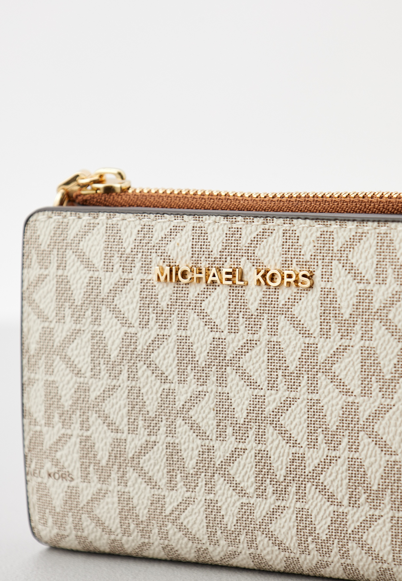 - Ванильный кошелек Michael Kors поместится в любой сумке и станет незаменимым аксессуаром на каждый день. Изделие выполнено из искусственной зернистой кожи с фирменной монограммой бренда. Кошелек застегивается на кнопку, внутри имеет отделение на молнии, а также множество слотов для карт. В оформлении модели использован логотип Michael Kors. Кошелек упакован в фирменную коробку.