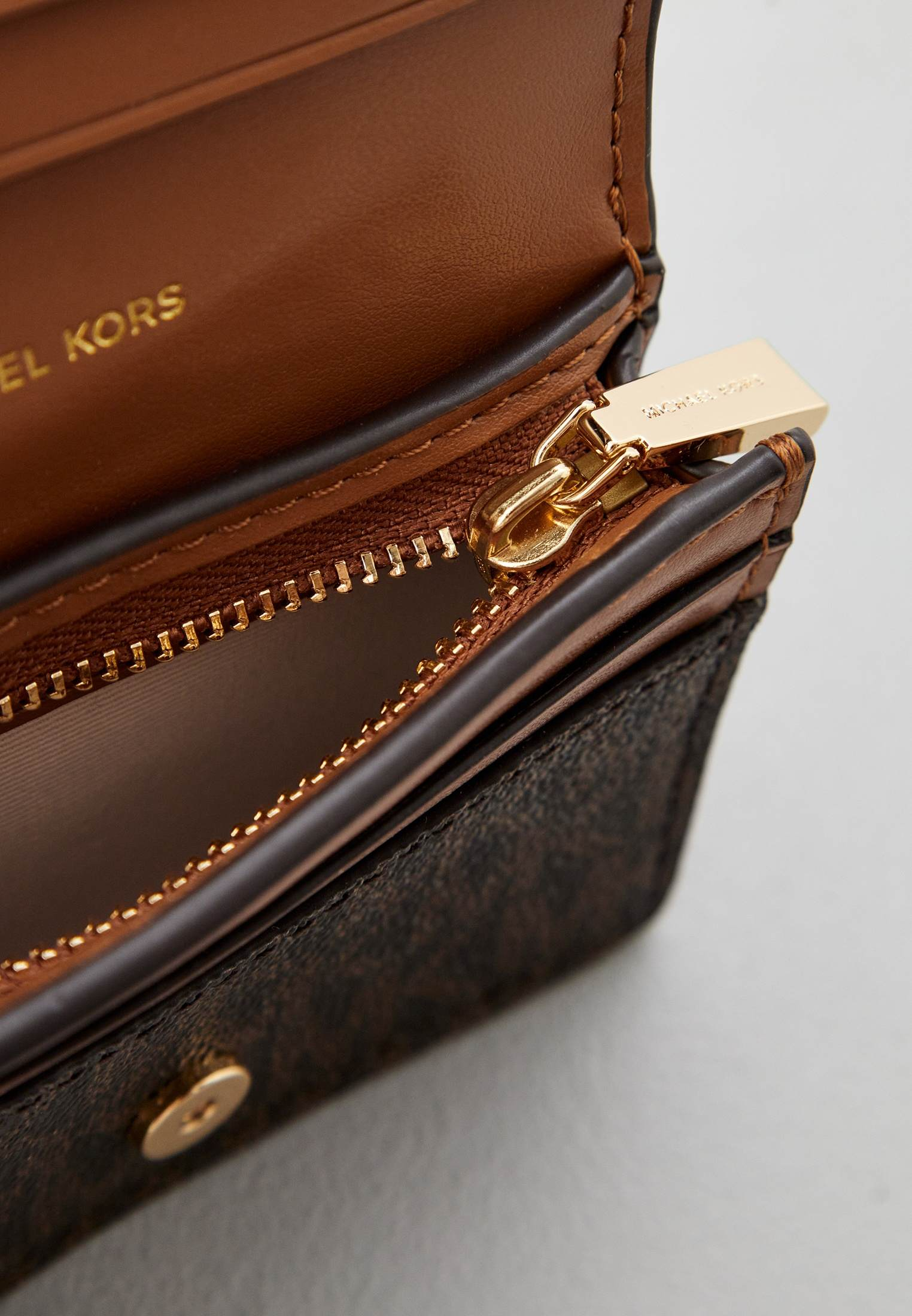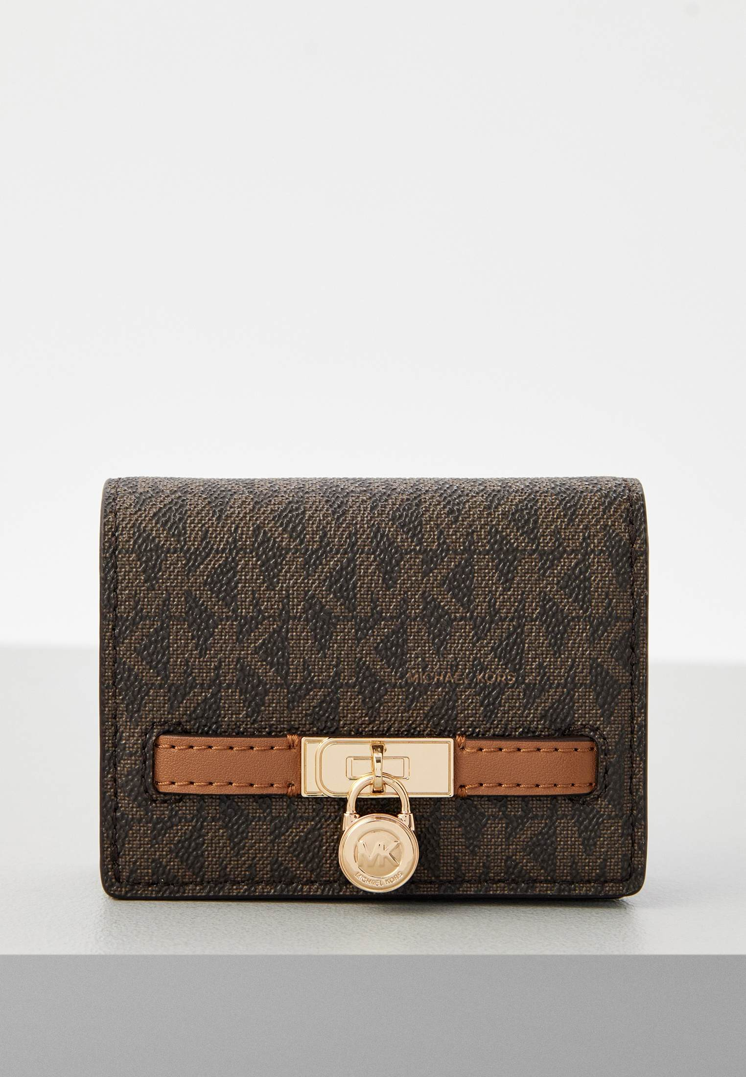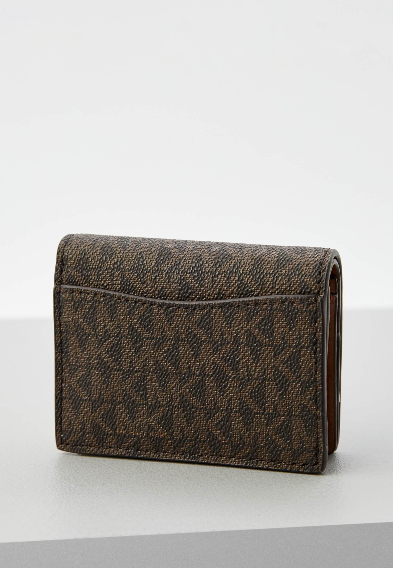 - Коричневый кошелек Michael Kors поместится в любой сумке и станет незаменимым аксессуаром на каждый день. Изделие выполнено из фактурной искусственной кожи с монограммой «MK» по всей поверхности. Аксессуар застегивается на магнитную кнопку, внутри имеет отделение на молнии, а также множество слотов для карт. Кошелек оформлен золотистым замочком с фирменным логотипом бренда.