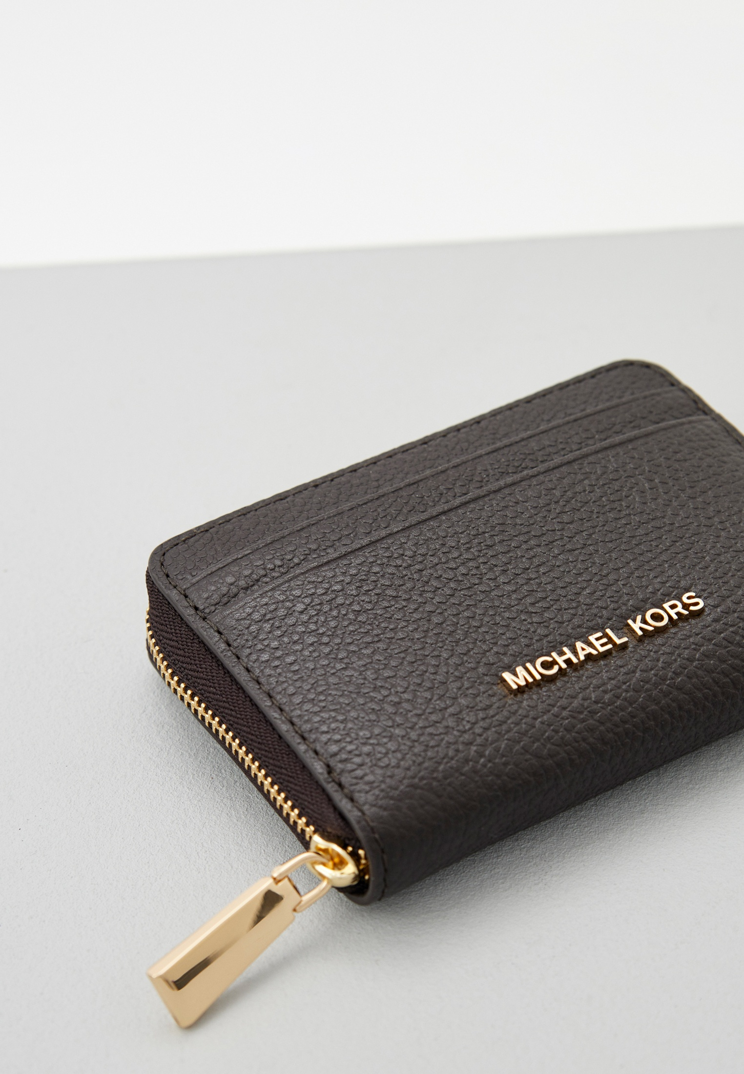 - Кошелек Michael Kors поместится в любой сумке и станет незаменимым аксессуаром на каждый день. Изделие выполнено из натуральной зернистой кожи. Кошелек застегивается на молнию, внутри имеет отделения для купюр и мелочи, а также множество слотов для карт снаружи. В оформлении модели использован фирменный логотип Michael Kors.