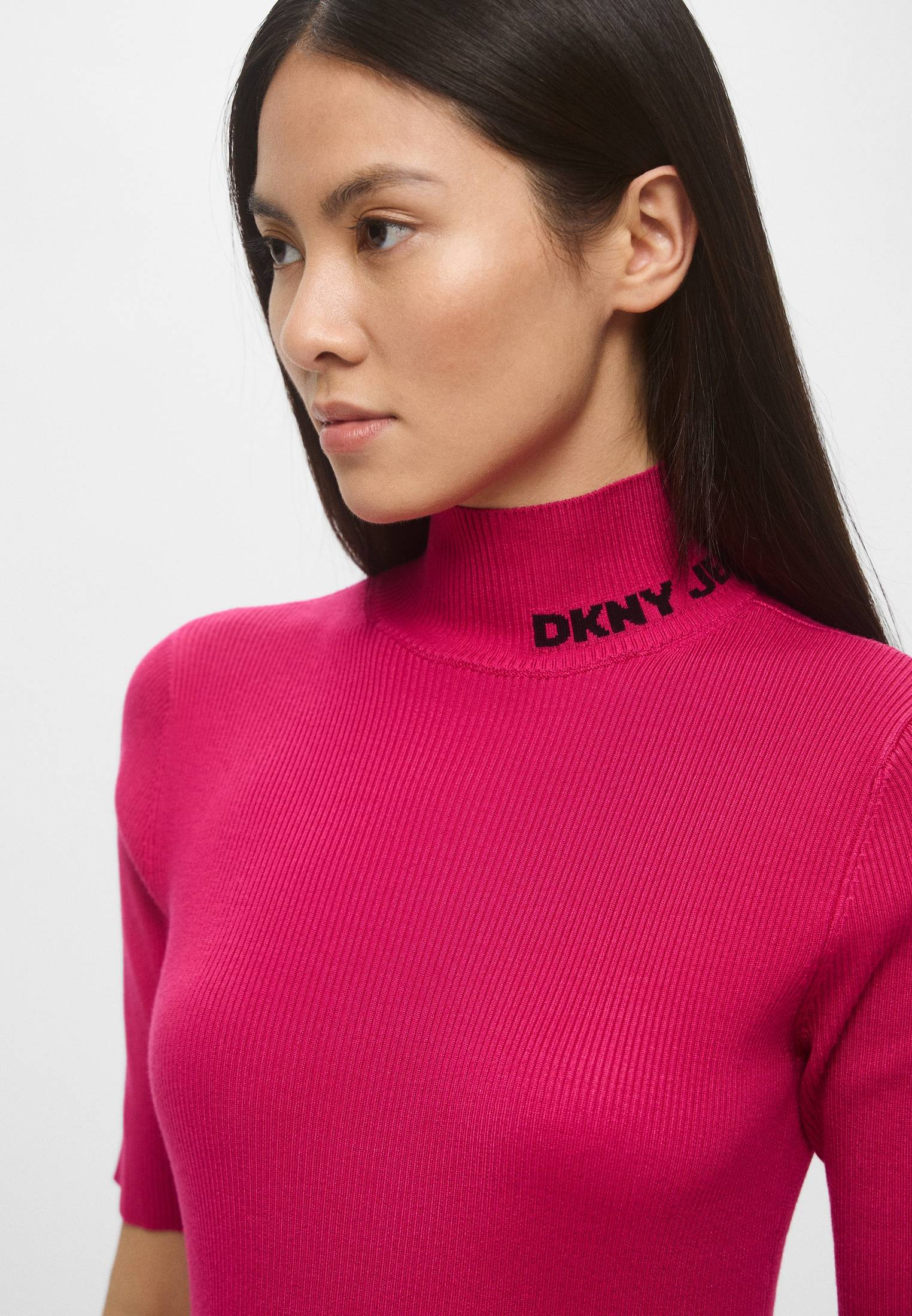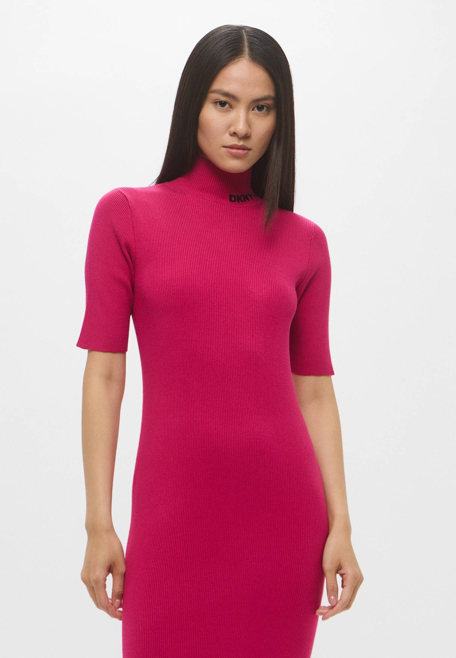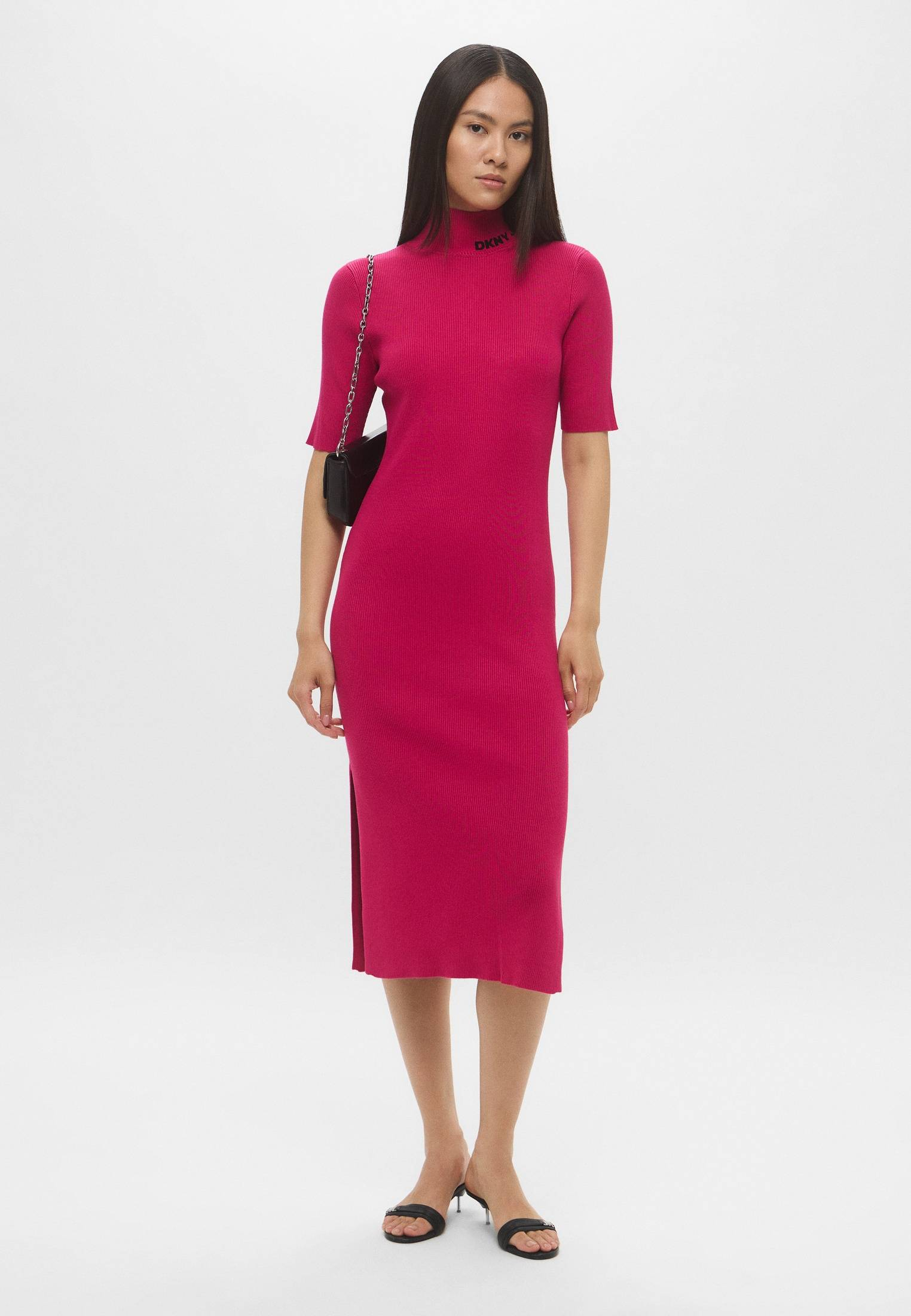 - Яркое, женственное, идеально подчеркивающее силуэт — розовое платье миди с коротким рукавом от DKNY. Модель с аккуратным разрезом сбоку выполнена из эластичного, приятного на ощупь трикотажа в рубчик. Воротник-стойка оформлен фирменным логотипом бренда. Сочетайте изделие с босоножками, элегантными туфлями или обувью на плоской подошве, представленной в ассортименте BNS Club.
