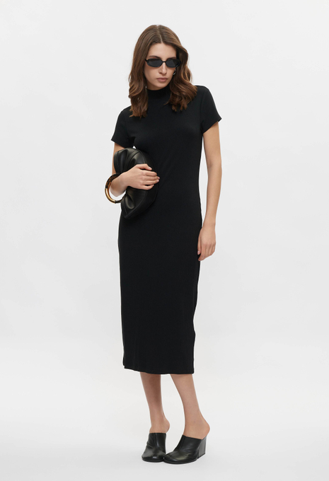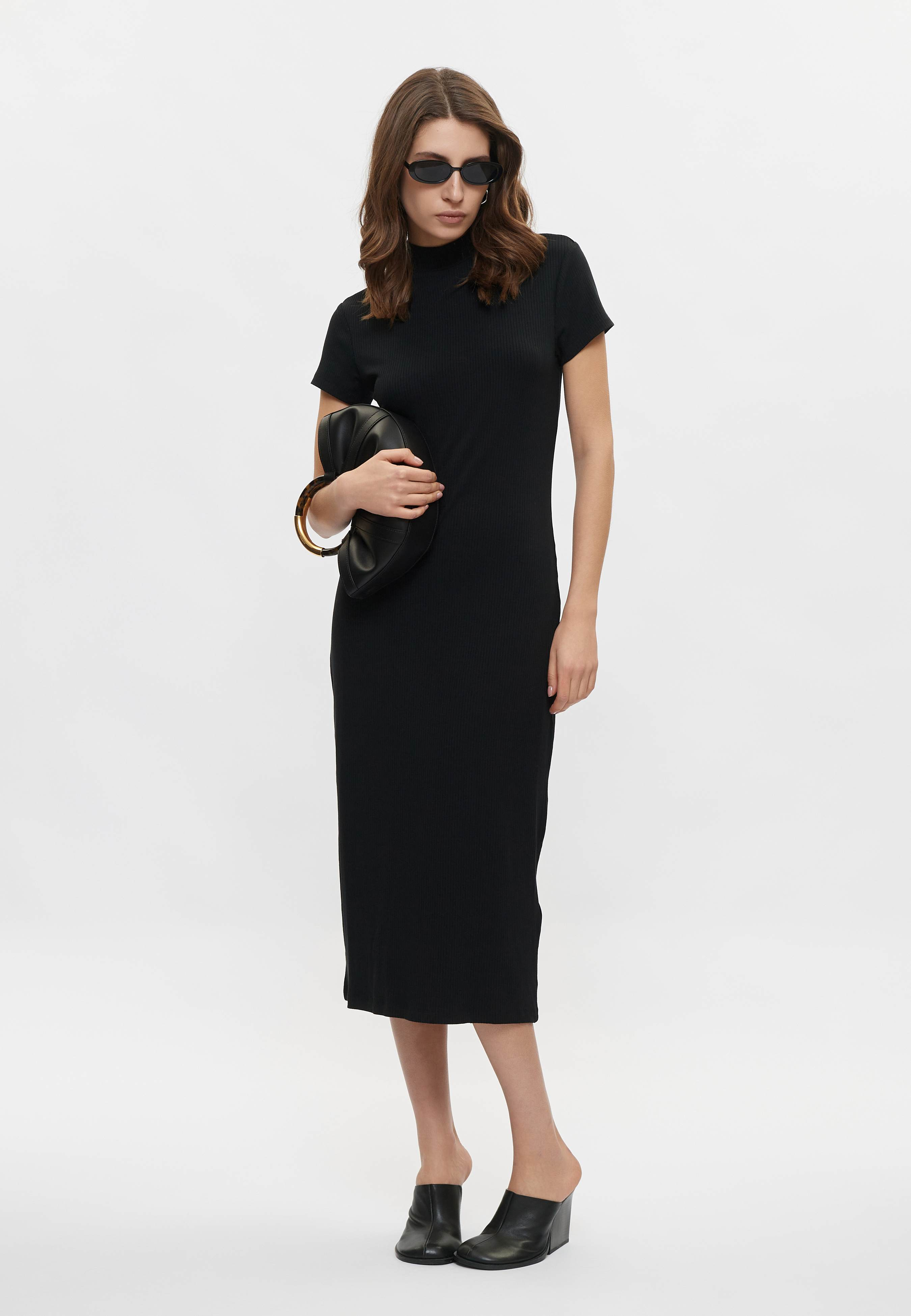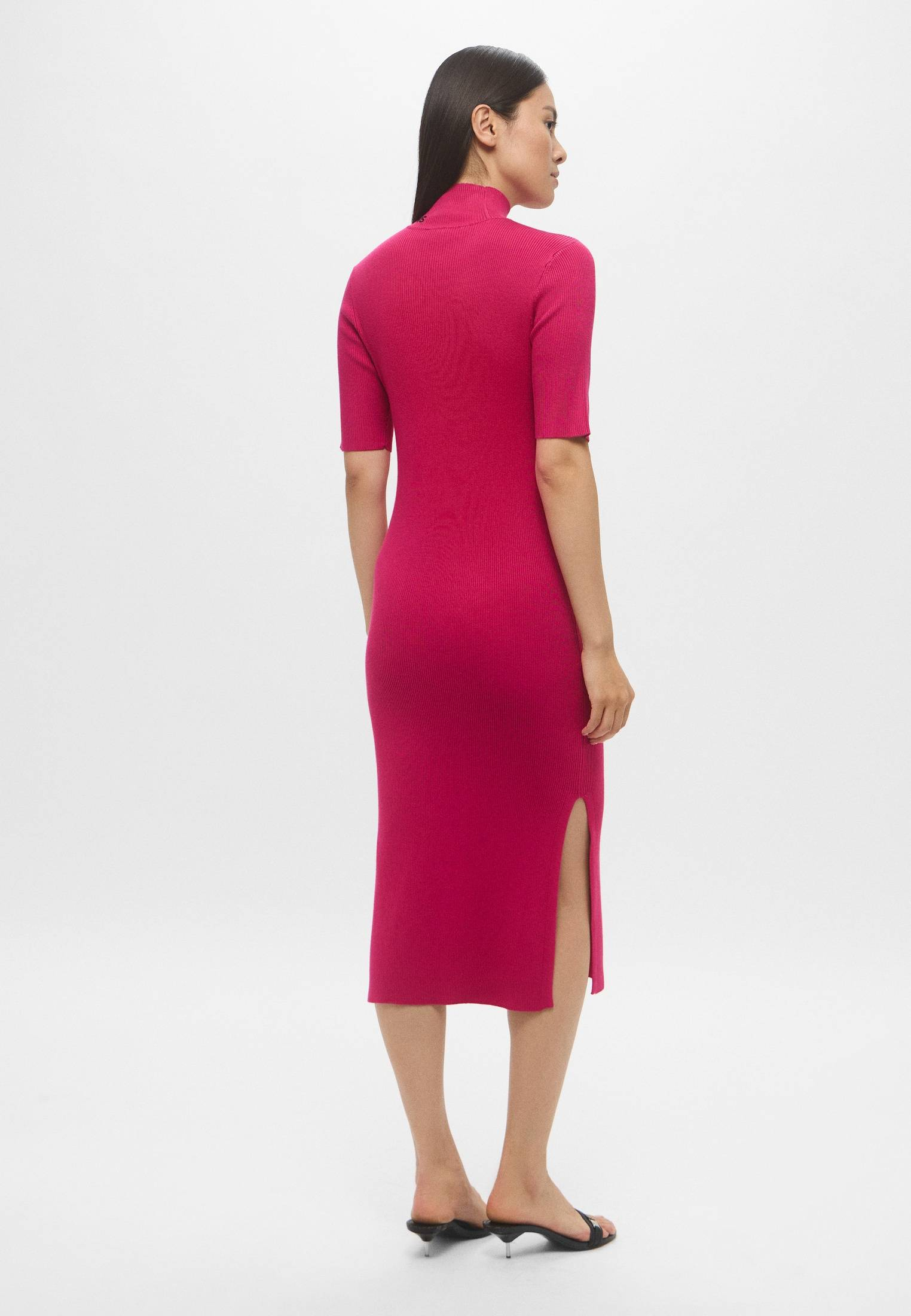 - Яркое, женственное, идеально подчеркивающее силуэт — розовое платье миди с коротким рукавом от DKNY. Модель с аккуратным разрезом сбоку выполнена из эластичного, приятного на ощупь трикотажа в рубчик. Воротник-стойка оформлен фирменным логотипом бренда. Сочетайте изделие с босоножками, элегантными туфлями или обувью на плоской подошве, представленной в ассортименте BNS Club.