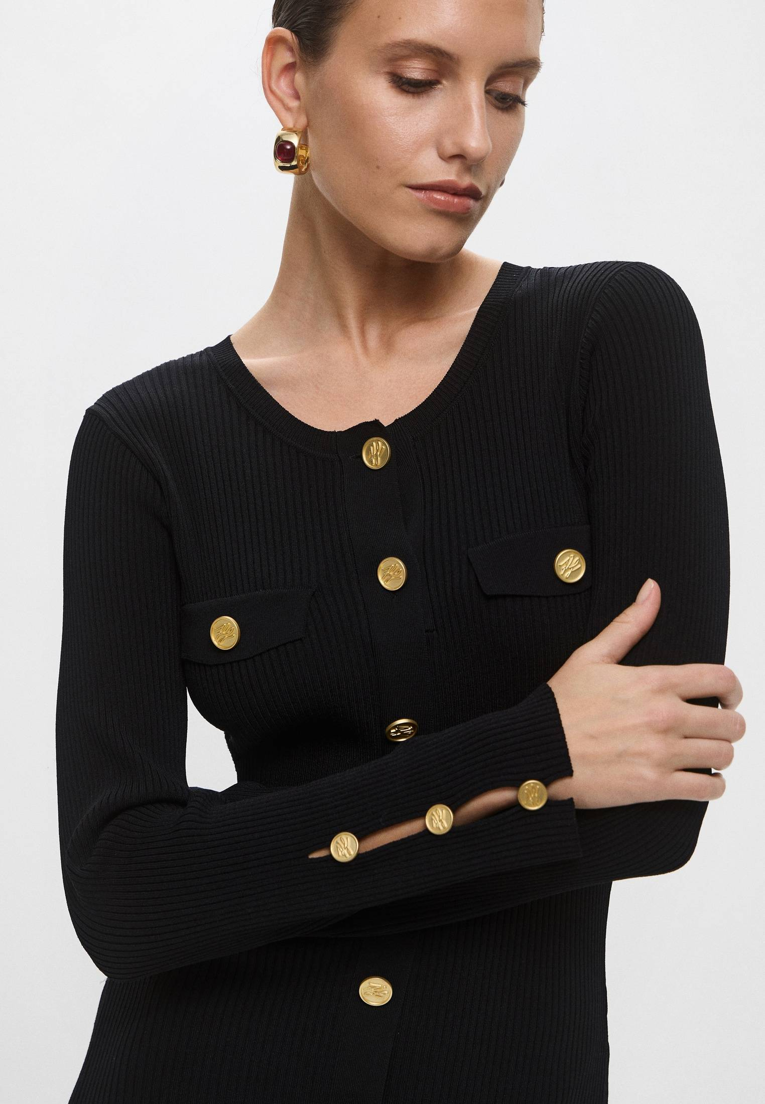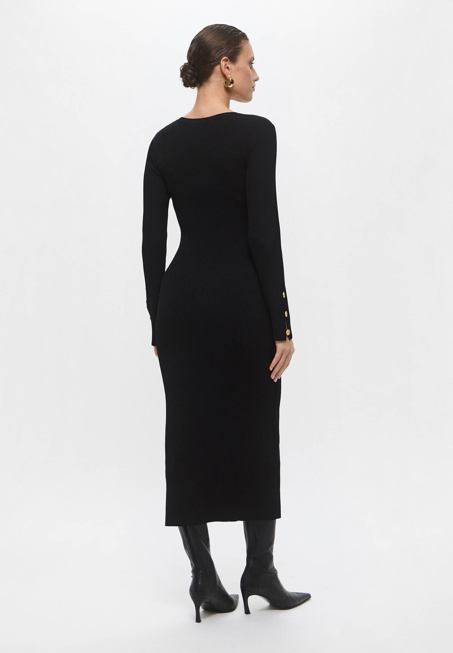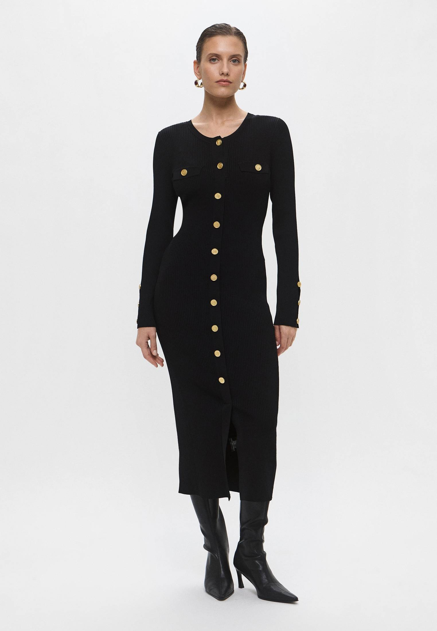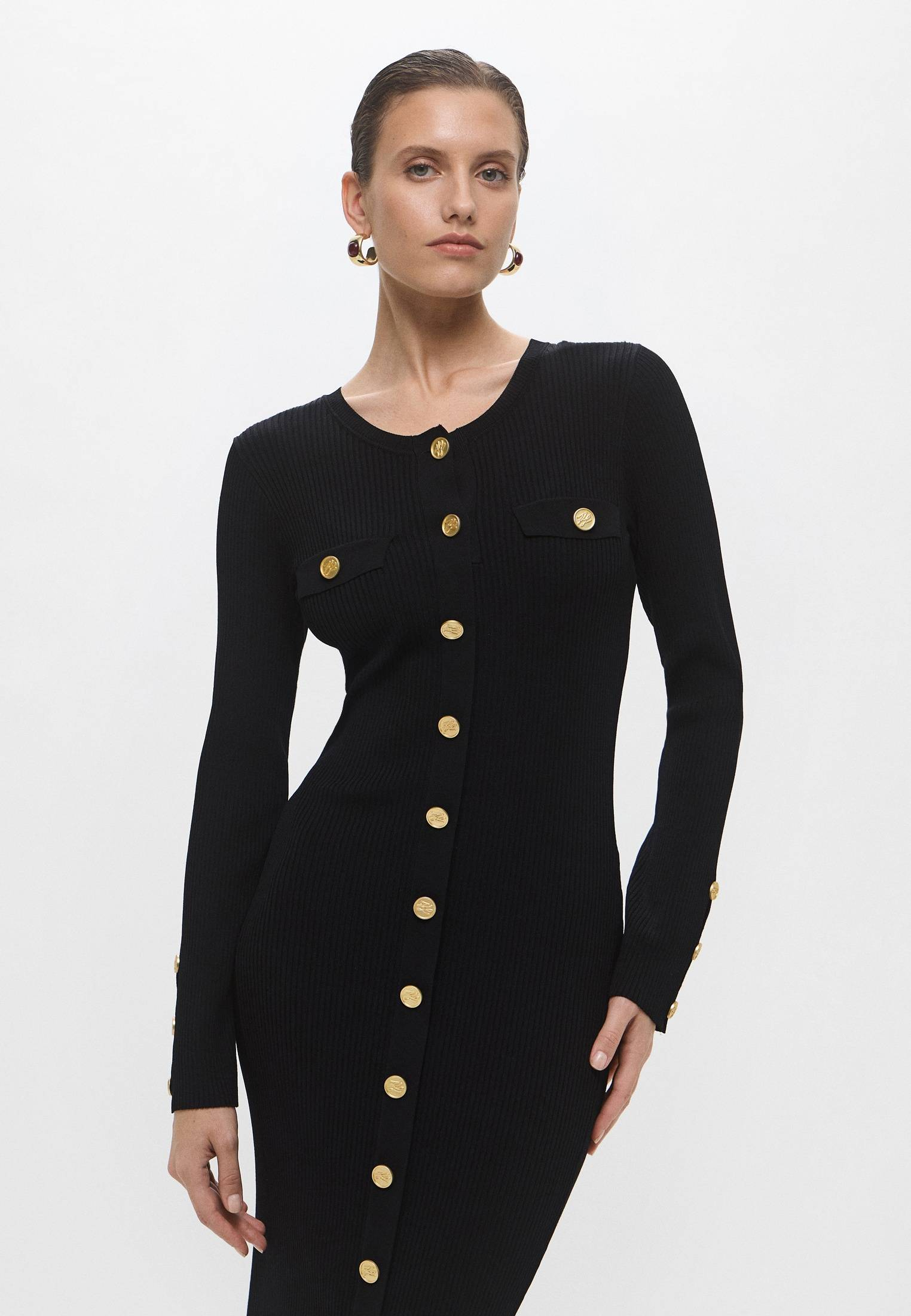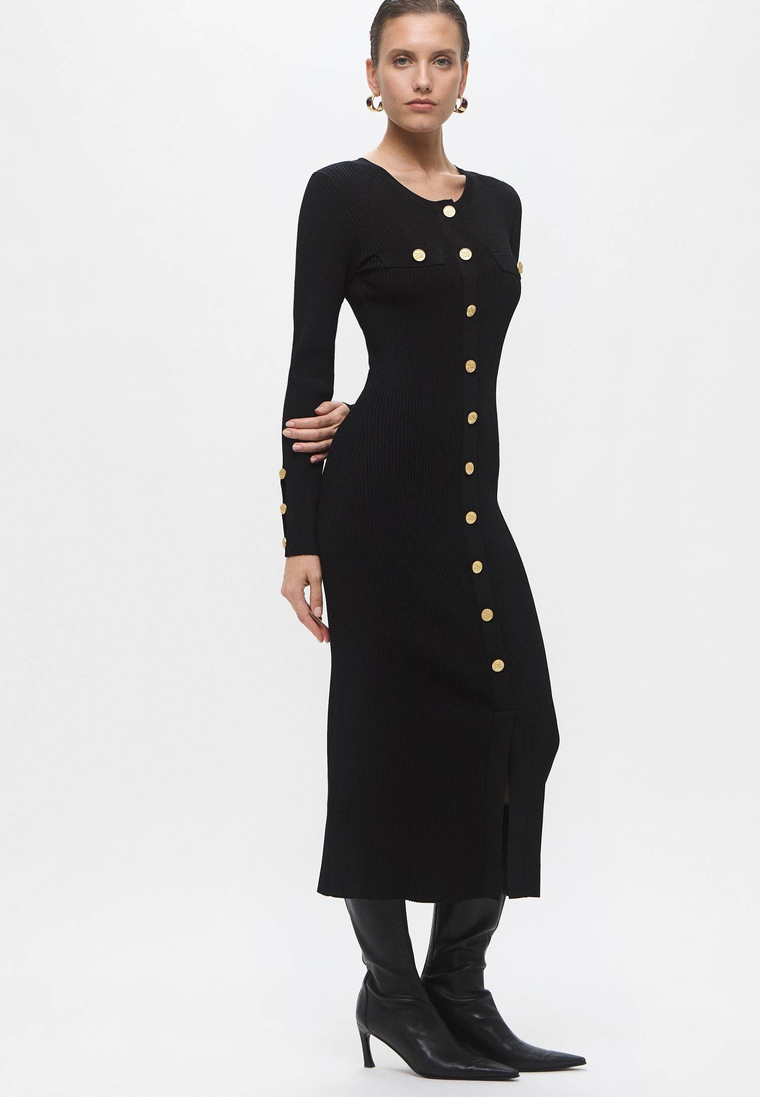 - Идеально для ваших вечерних выходов! Изящное черное платье миди от Karl Lagerfeld станет прекрасной базой для женственных и элегантных образов. Модель с длинными рукавами выполнена из мягкого трикотажа в рубчик на основе вискозы. Приятный на ощупь материал облегает фигуру, выгодно подчеркивая каждый изгиб. Платье застегивается на золотистые пуговицы. Сочетайте модель с босоножками, туфлями, ботильонами или любой другой обувью из ассортимента BNS Club. Дополните образ небольшой сумкой на плечо или моделью кросс-боди из коллекции Karl Lagerfeld.