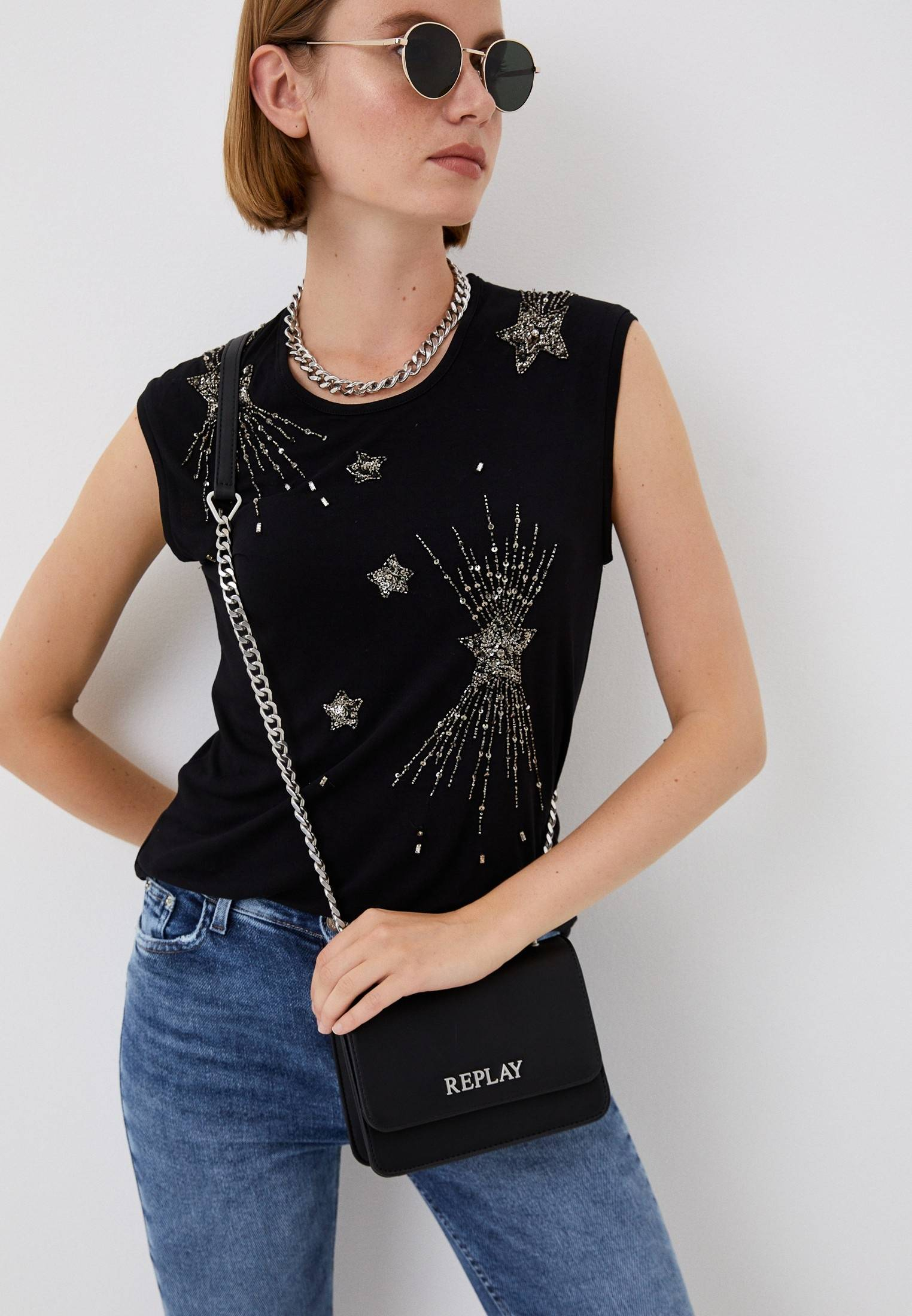 - Эта компактная черная сумка кросс-боди на ремне-цепочке прекрасно завершит любой образ вне зависимости от цветовой палитры. Аксессуар выполнен из искусственной кожи. По своим свойствам и характеристикам материал ничем не уступает натуральному: он прочен, но в то же время достаточно пластичен и мягок. В оформлении изделия использован фирменный логотип бренда Replay. Сумка застегивается на магнитную кнопку. Регулируемый ремень, декорированный металлическими звездами, позволяет носить модель как через плечо, так и на плече.