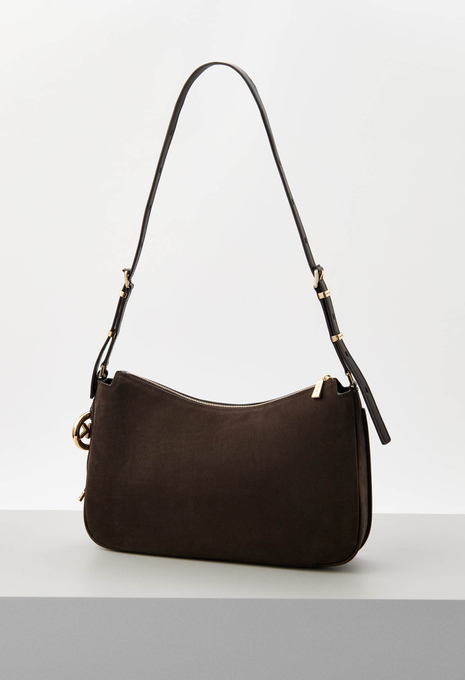 - Маленький аксессуар от Michael Kors изготовлен из натуральной зернистой кожи. Благодаря компактному размеру в сумке можно носить все необходимое. Модель дополнена плечевым ремнем-цепью, легко трансформирующимся в ручки.