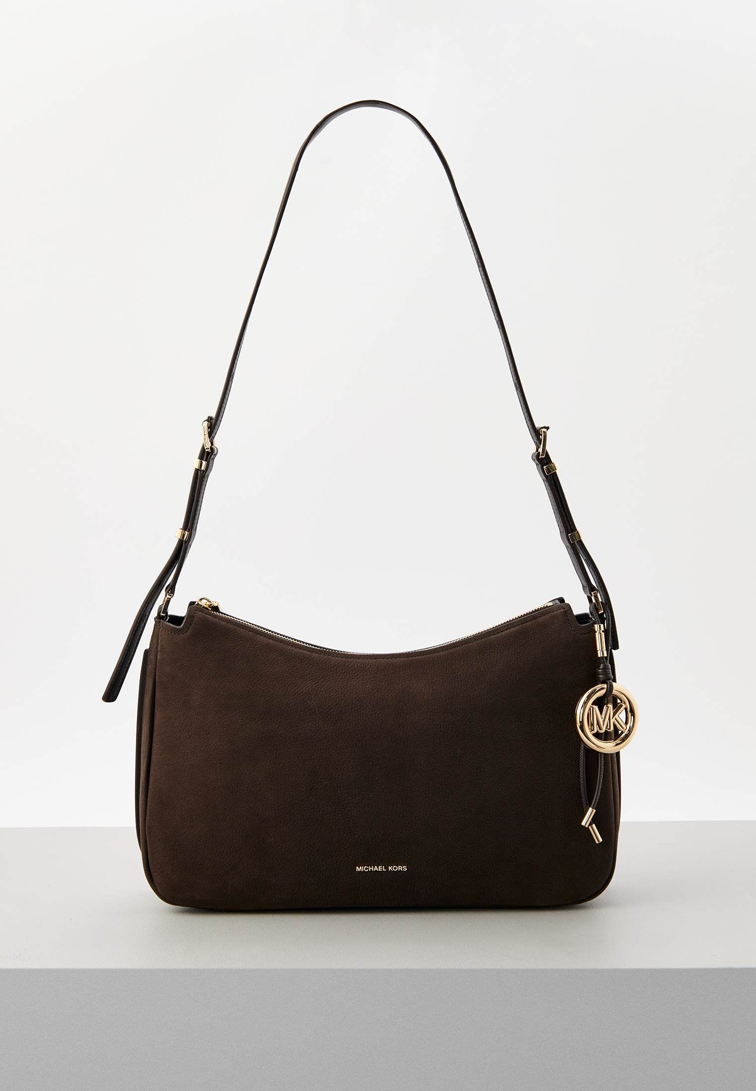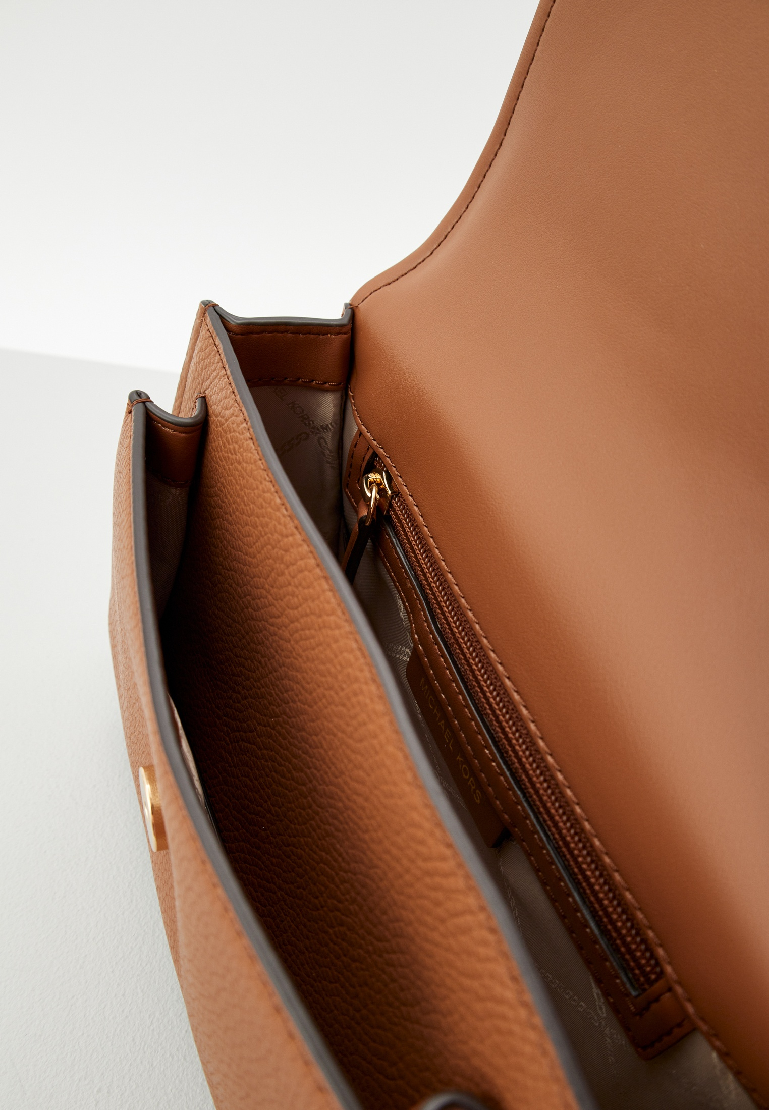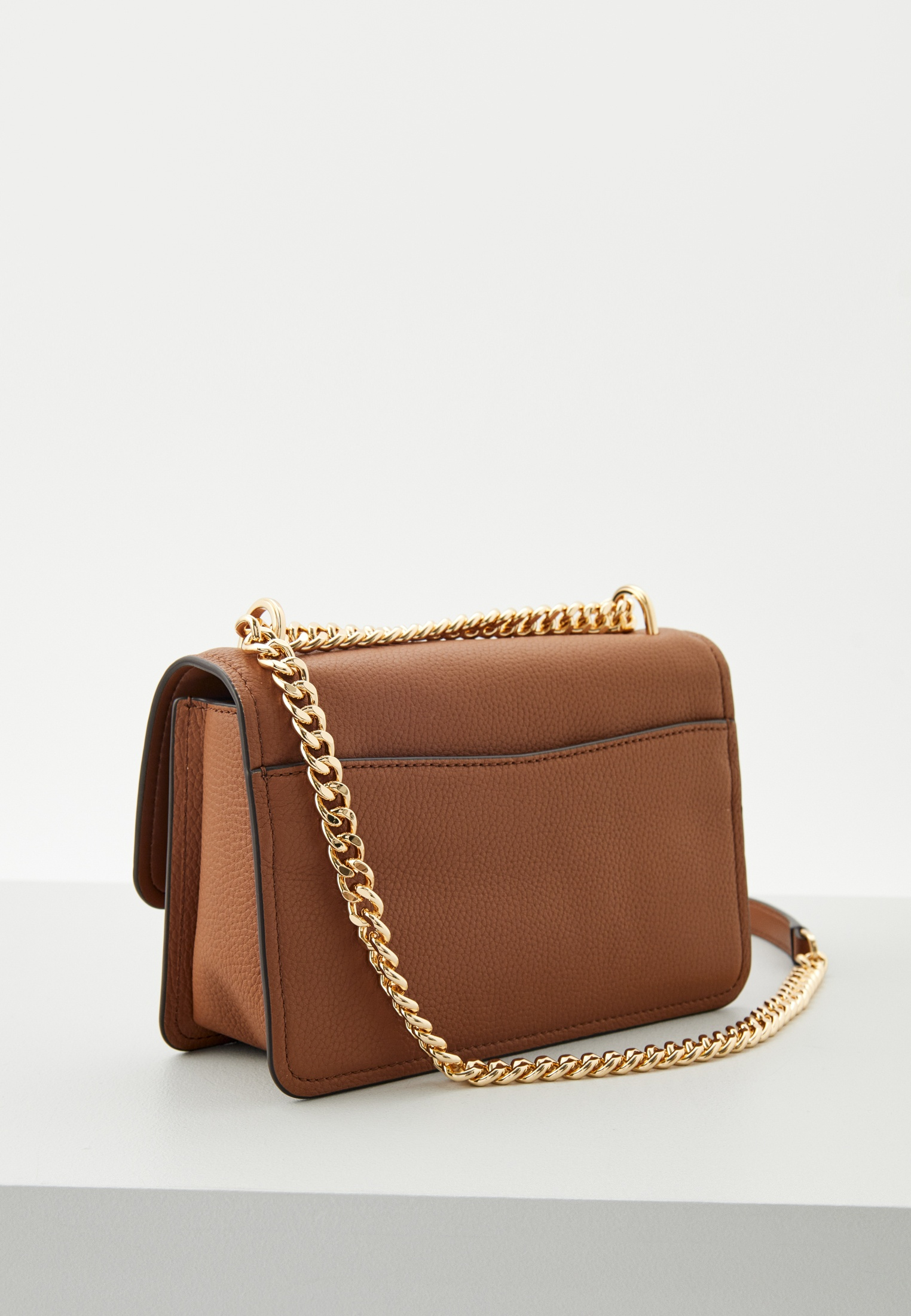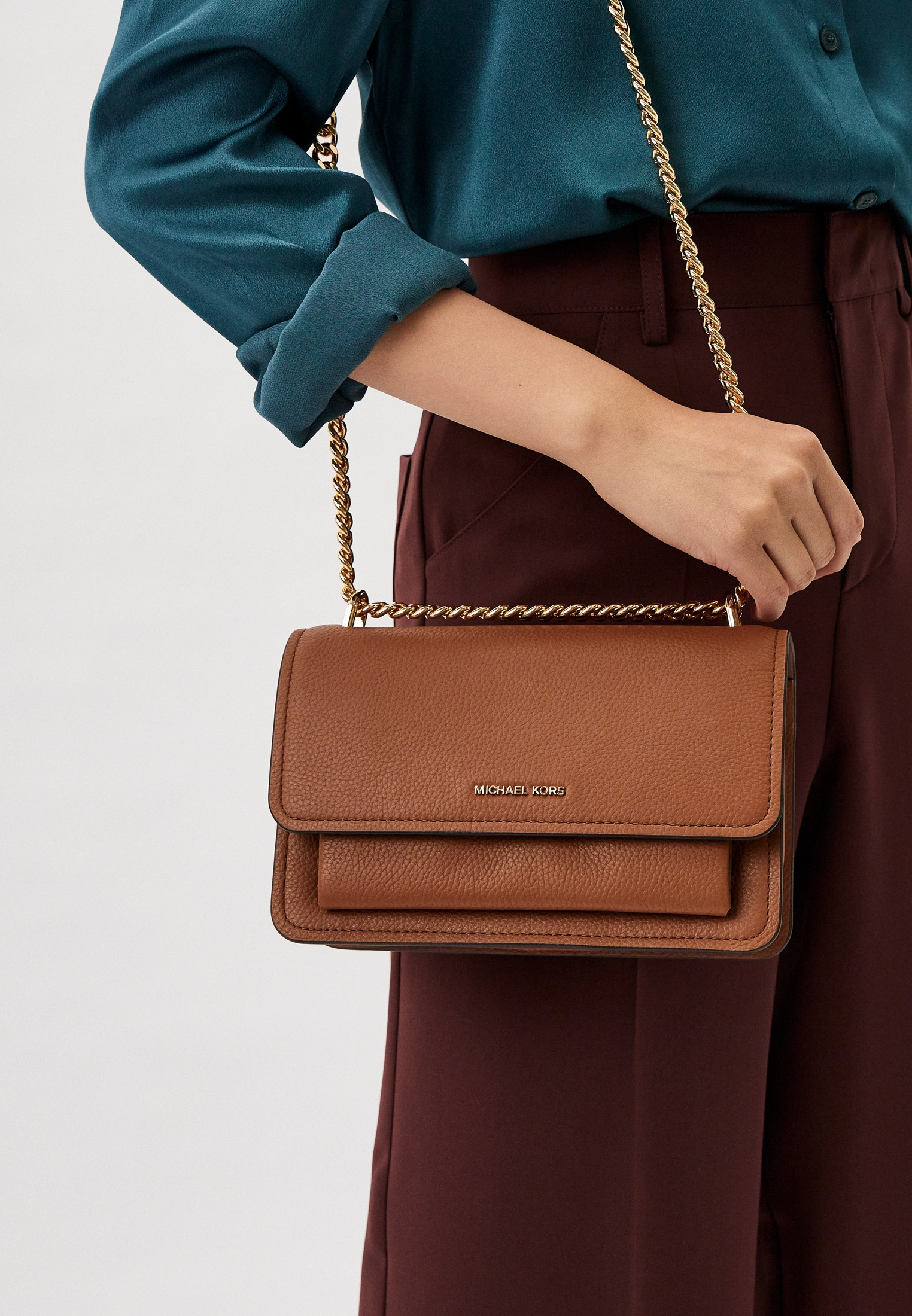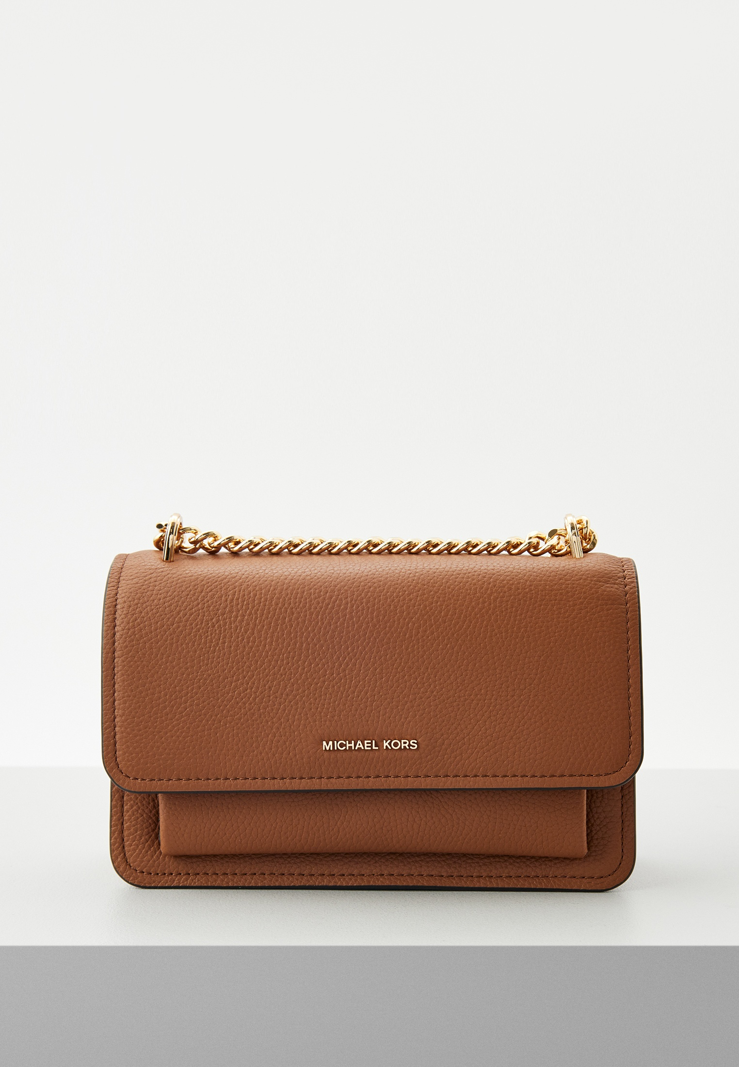 - Маленький аксессуар от Michael Kors изготовлен из натуральной зернистой кожи. Благодаря компактному размеру в сумке можно носить все необходимое. Модель дополнена плечевым ремнем-цепью, легко трансформирующимся в ручки.