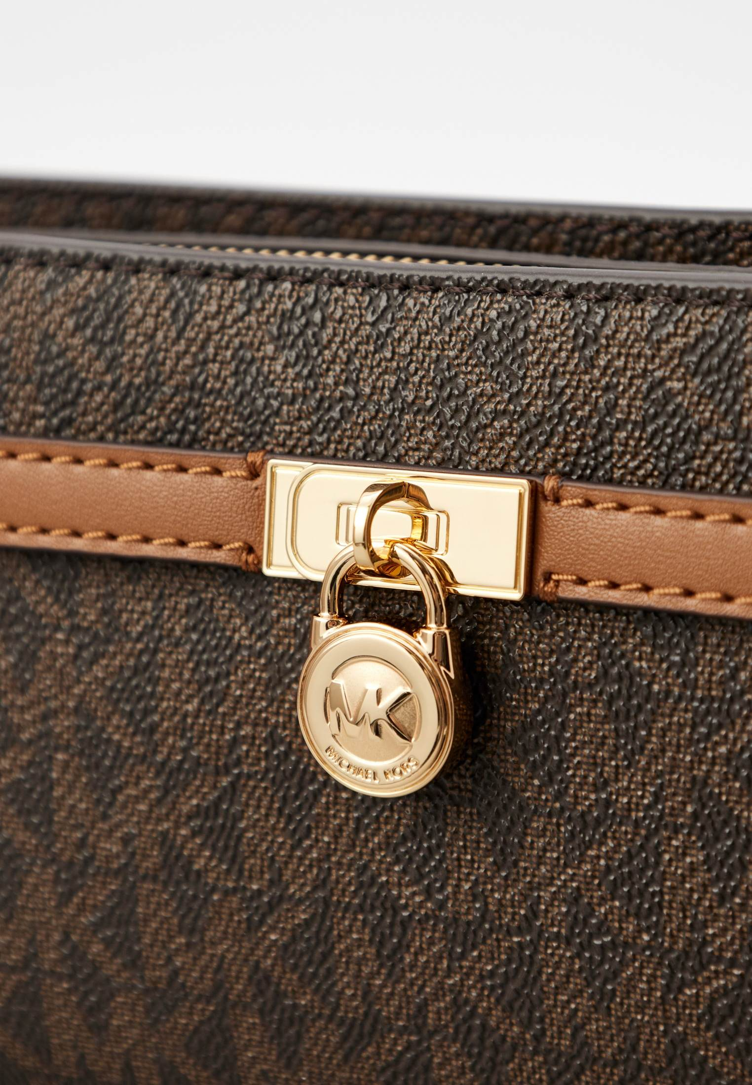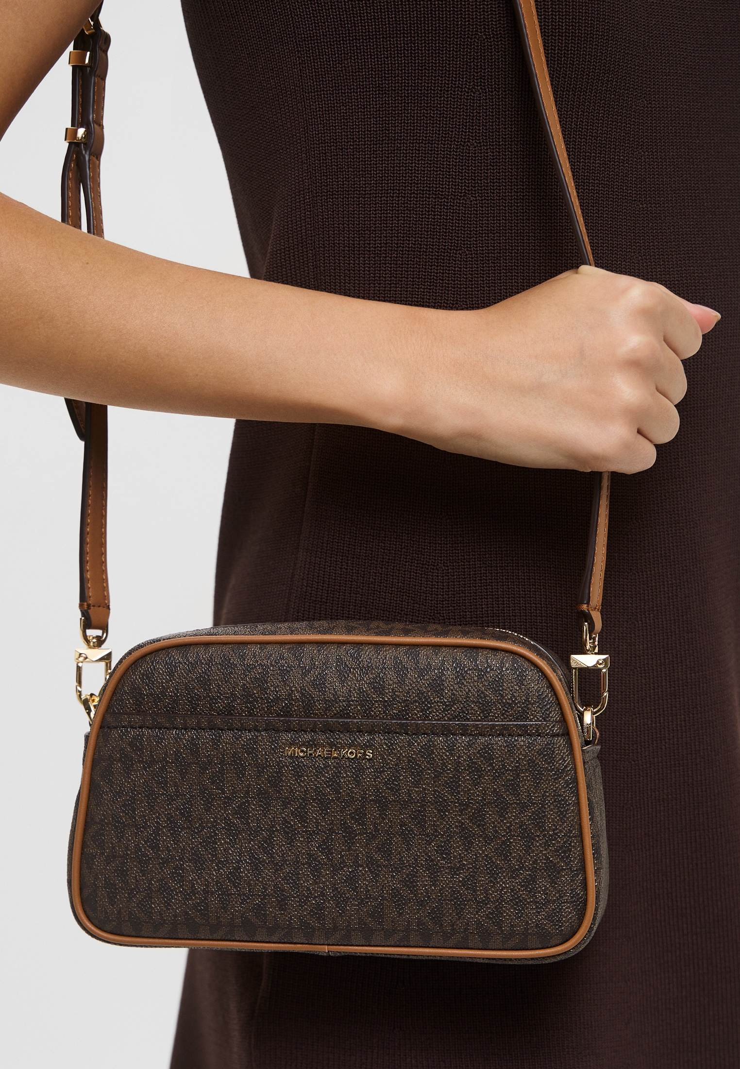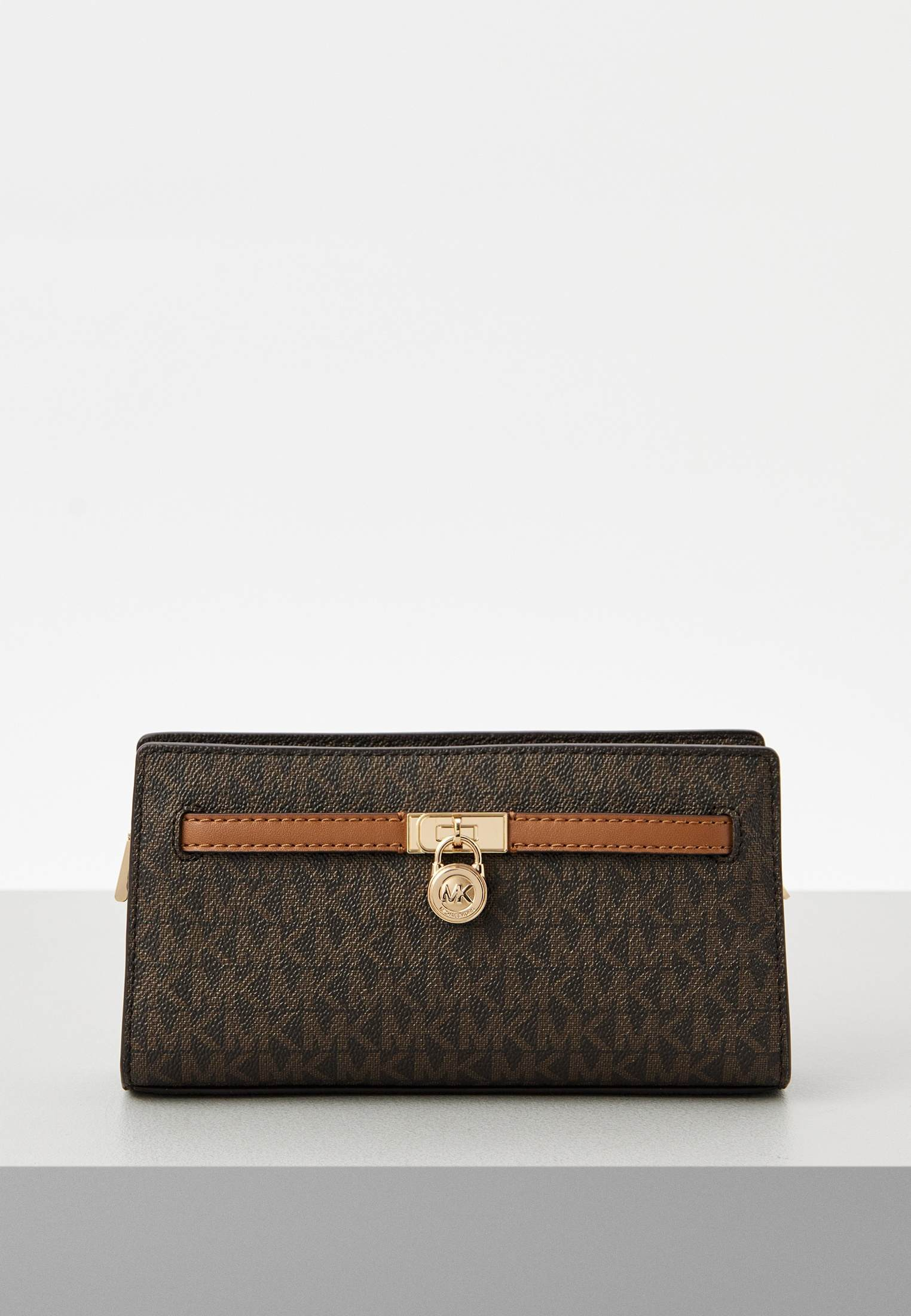 - Идеально для ваших женственных вечерних образов — коричневая сумка HAMILTON MODERNE от Michael Kors. Изделие выполнено из фактурной искусственной кожи с монограммой «MK» по всей поверхности. Сумка застегивается на молнию, имеет одно внутреннее отделение с карманом, внешний карман на магнитной кнопке и съемный ремешок-цепочку, позволяющий носить модель не только на плече, но и как стильный клатч. Аксессуар оформлен золотистым замочком с фирменным логотипом бренда.