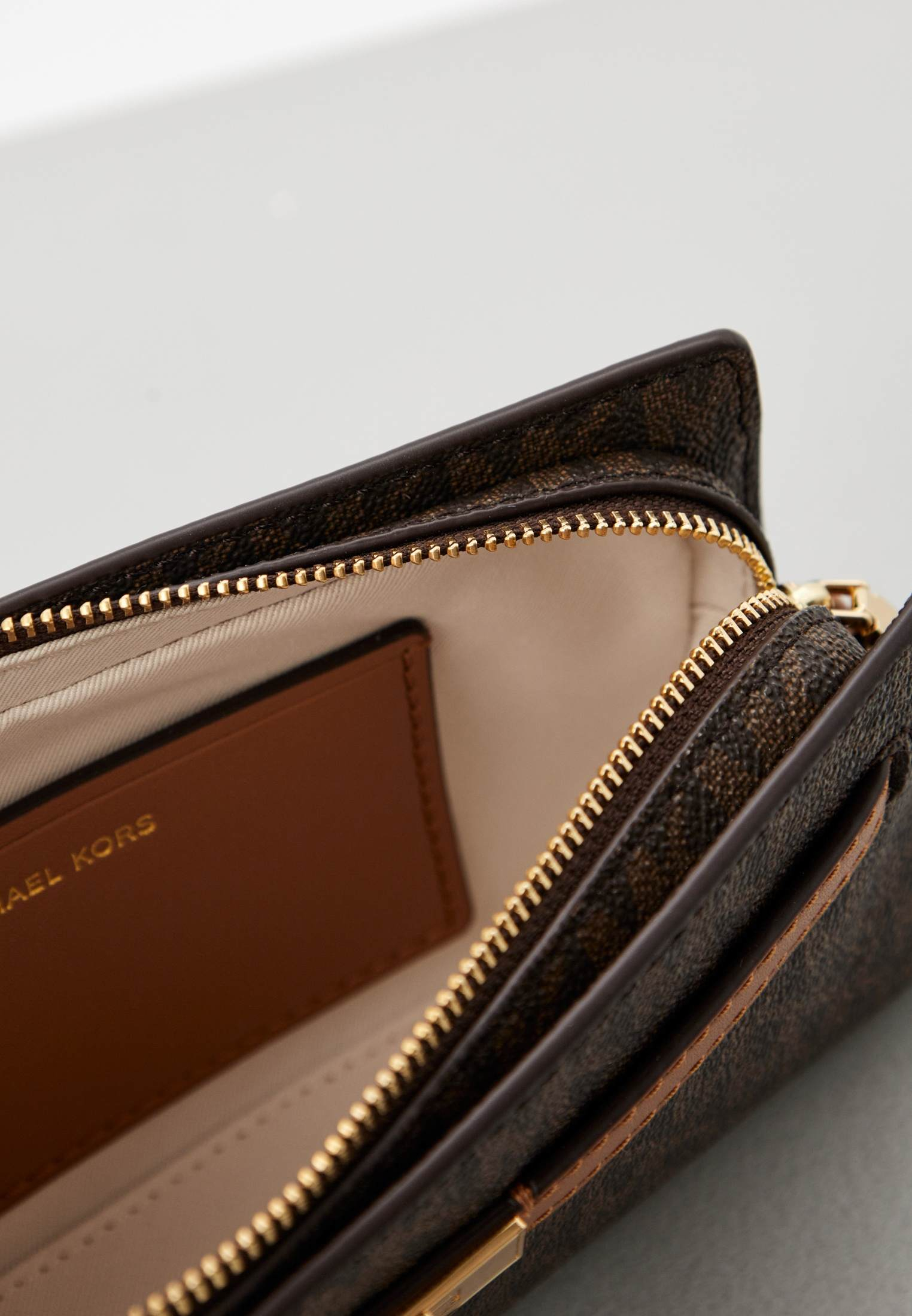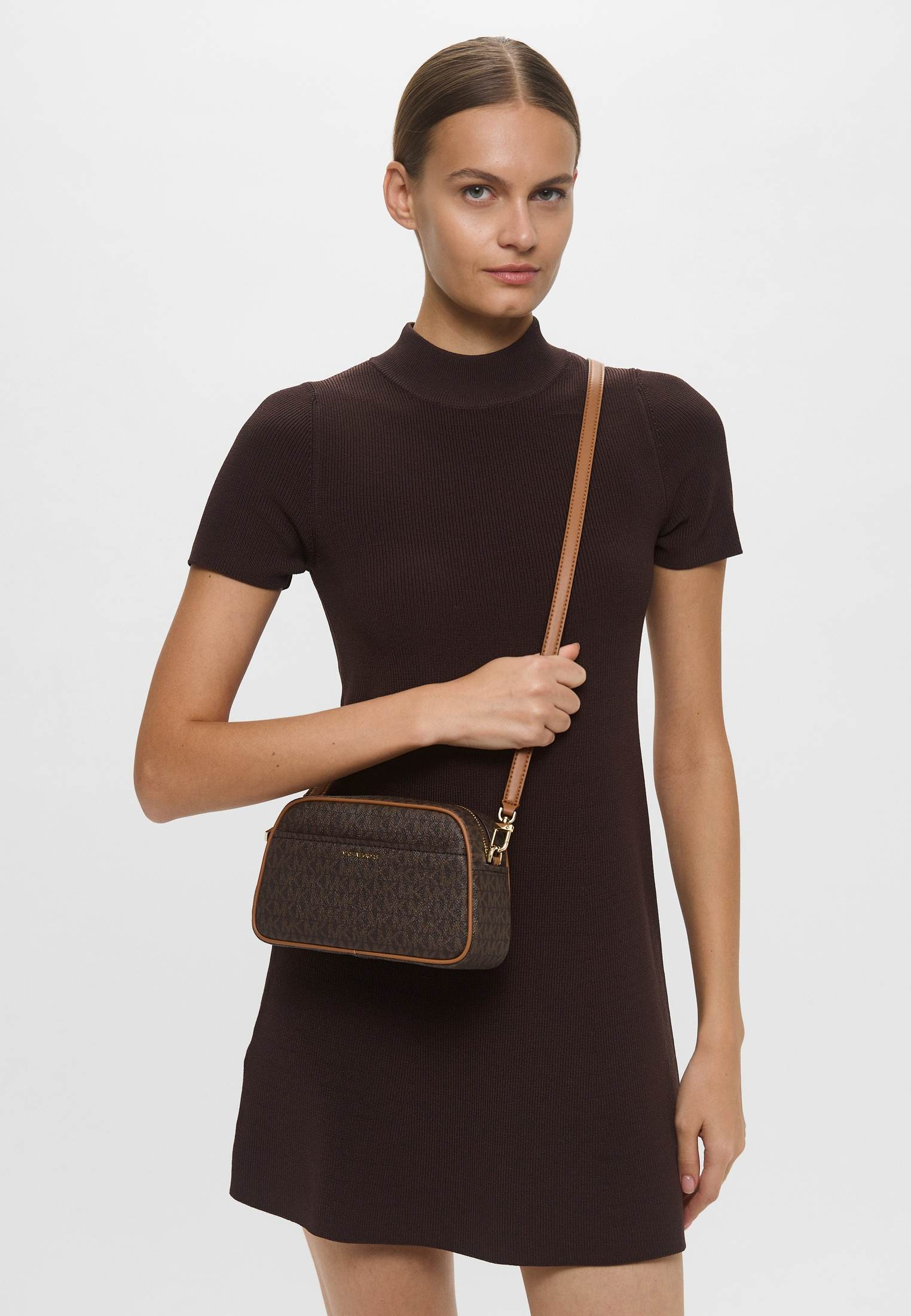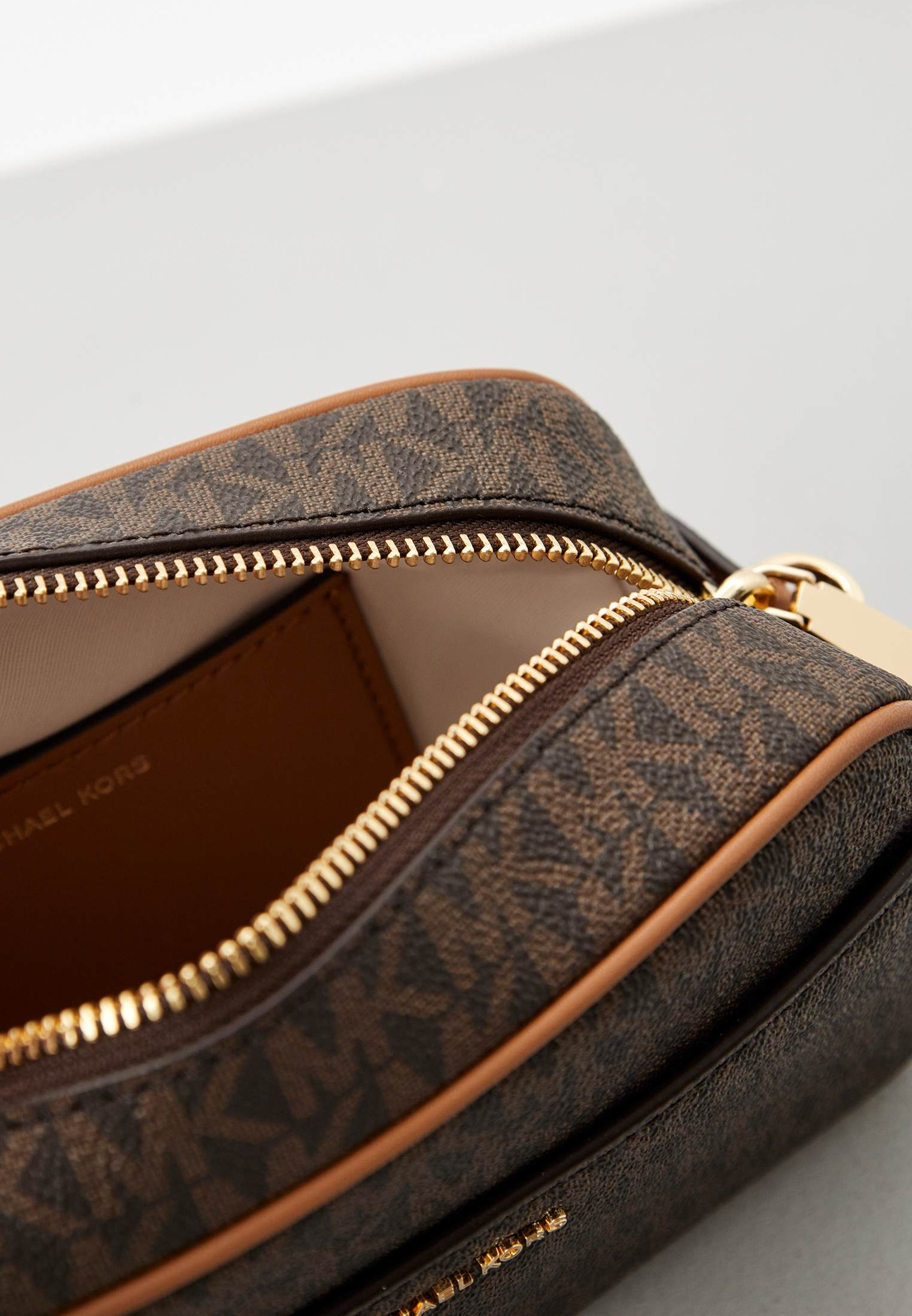 - Идеально для ваших женственных вечерних образов — коричневая сумка HAMILTON MODERNE от Michael Kors. Изделие выполнено из фактурной искусственной кожи с монограммой «MK» по всей поверхности. Сумка застегивается на молнию, имеет одно внутреннее отделение с карманом, внешний карман на магнитной кнопке и съемный ремешок-цепочку, позволяющий носить модель не только на плече, но и как стильный клатч. Аксессуар оформлен золотистым замочком с фирменным логотипом бренда.