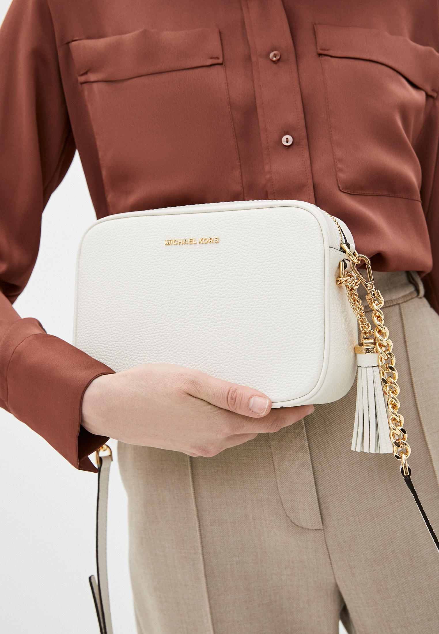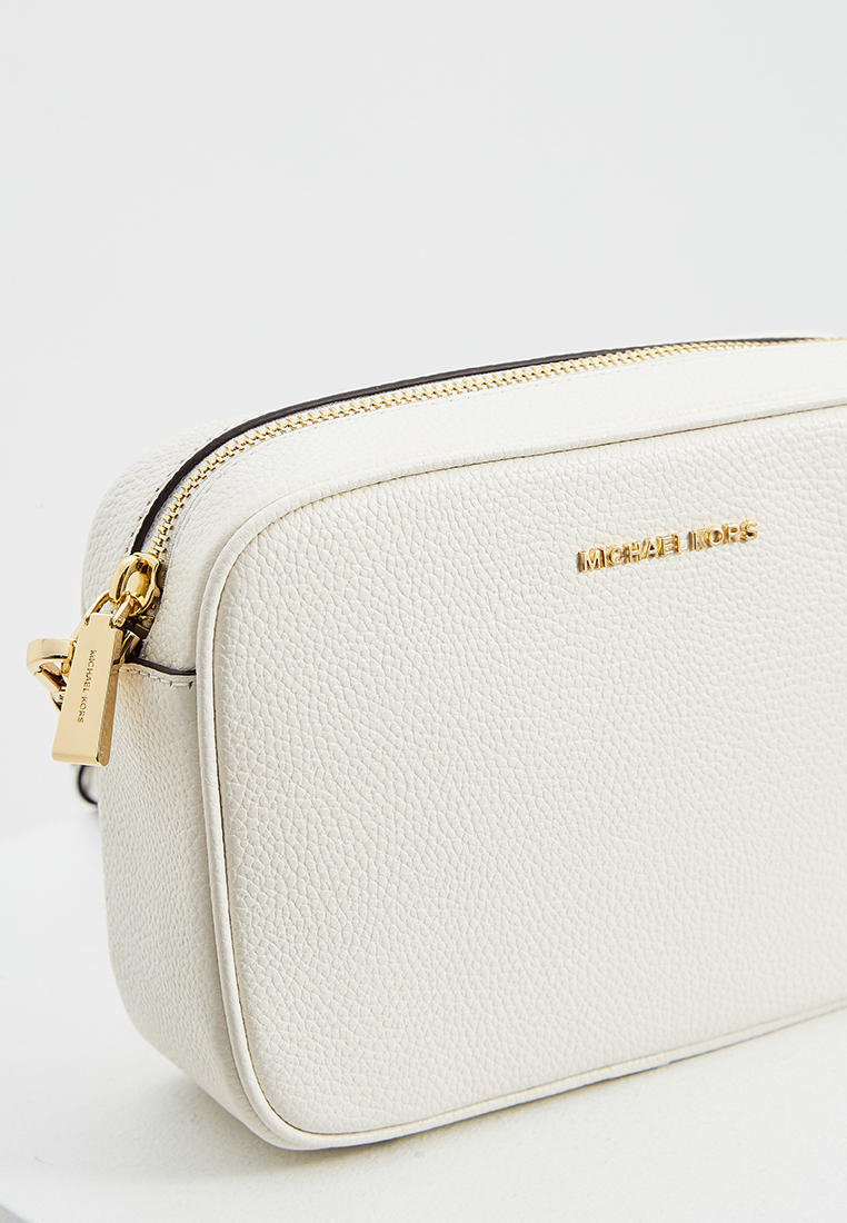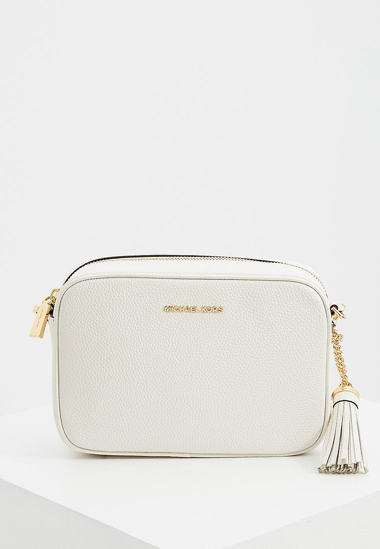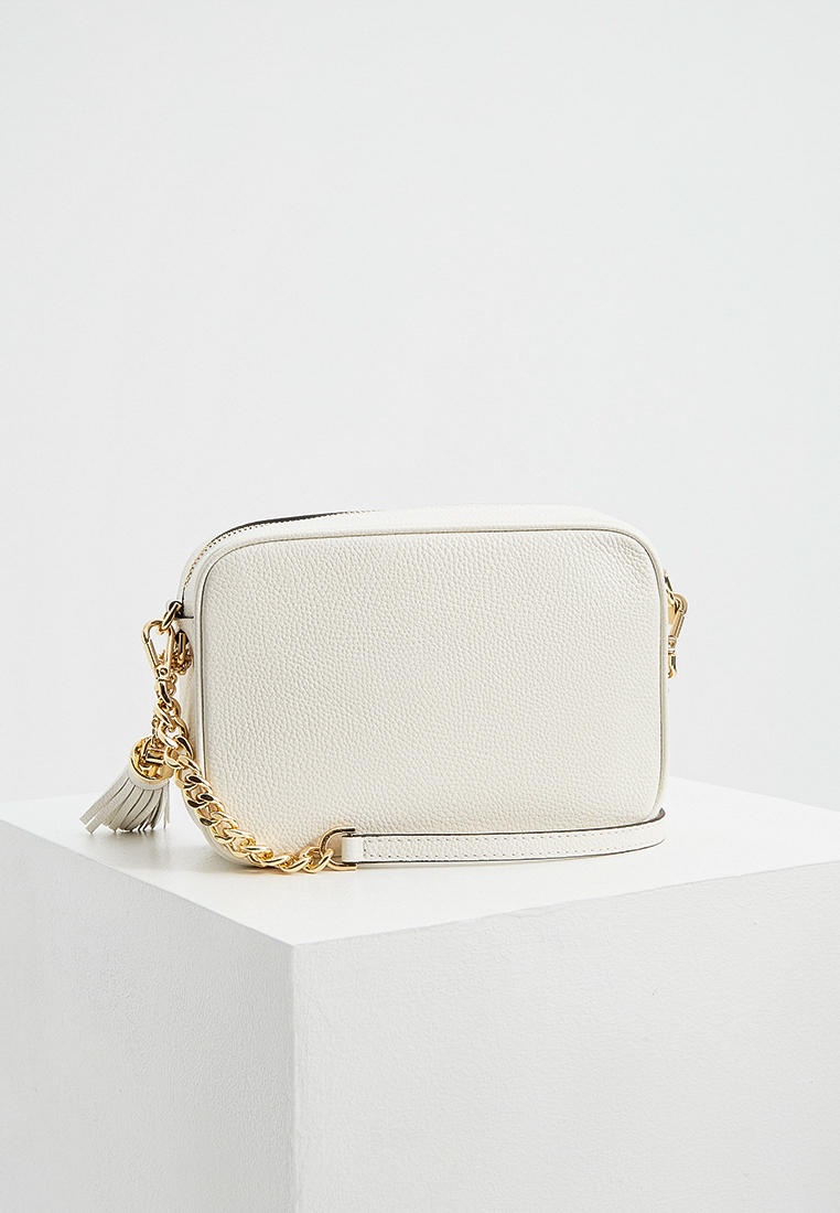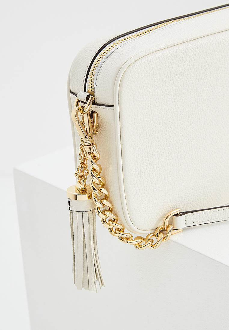 - Классическая сумка camera bag в исполнении Michael Kors – прямоугольная форма, застежка по верху и длинный плечевой ремешок, украшенный цепочкой. Внутри сумки предусмотрен дополнительный карман на молнии. Модель выполнена из натуральной кожи с зернистой фактурой и украшена блестящим логотипом.