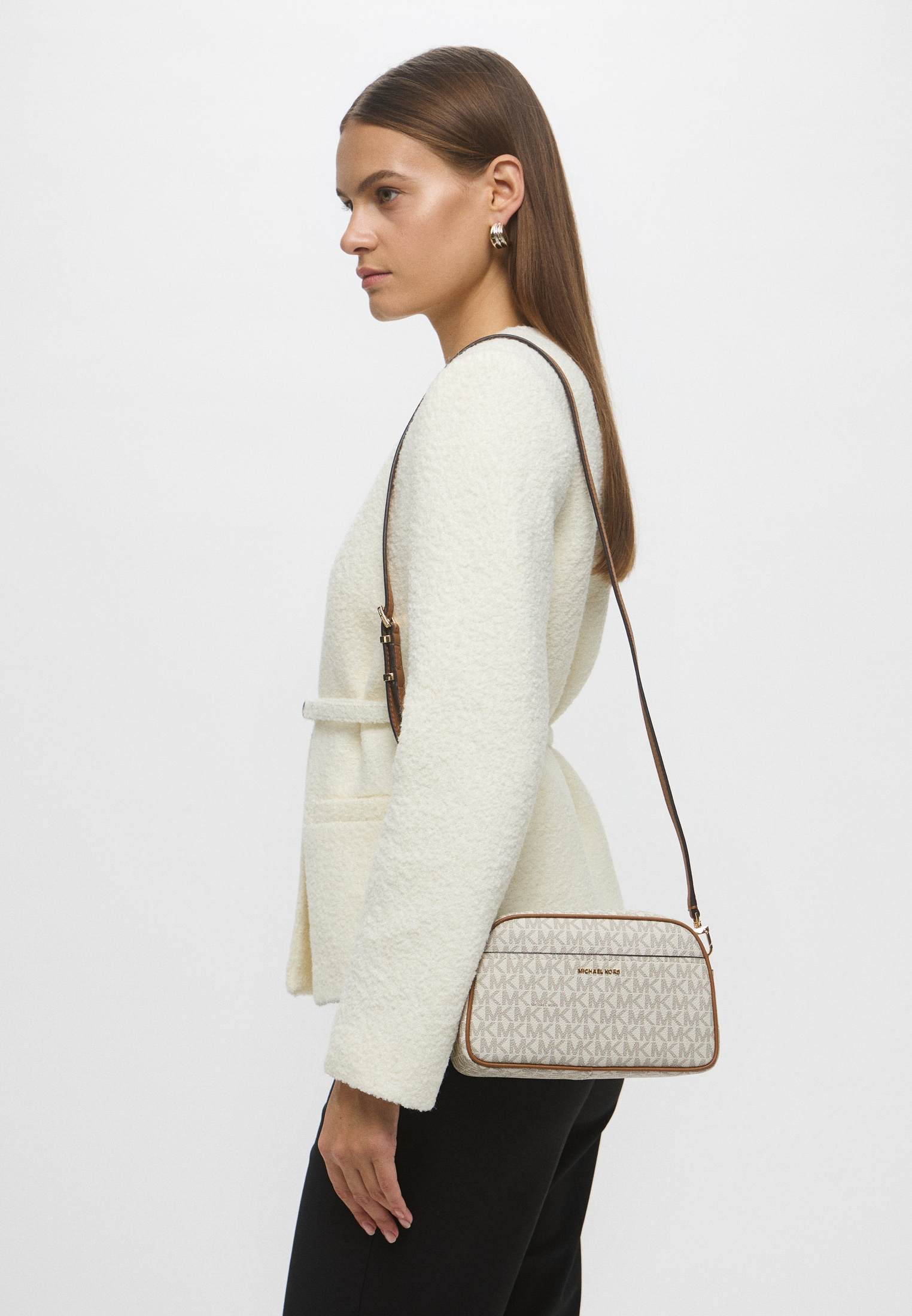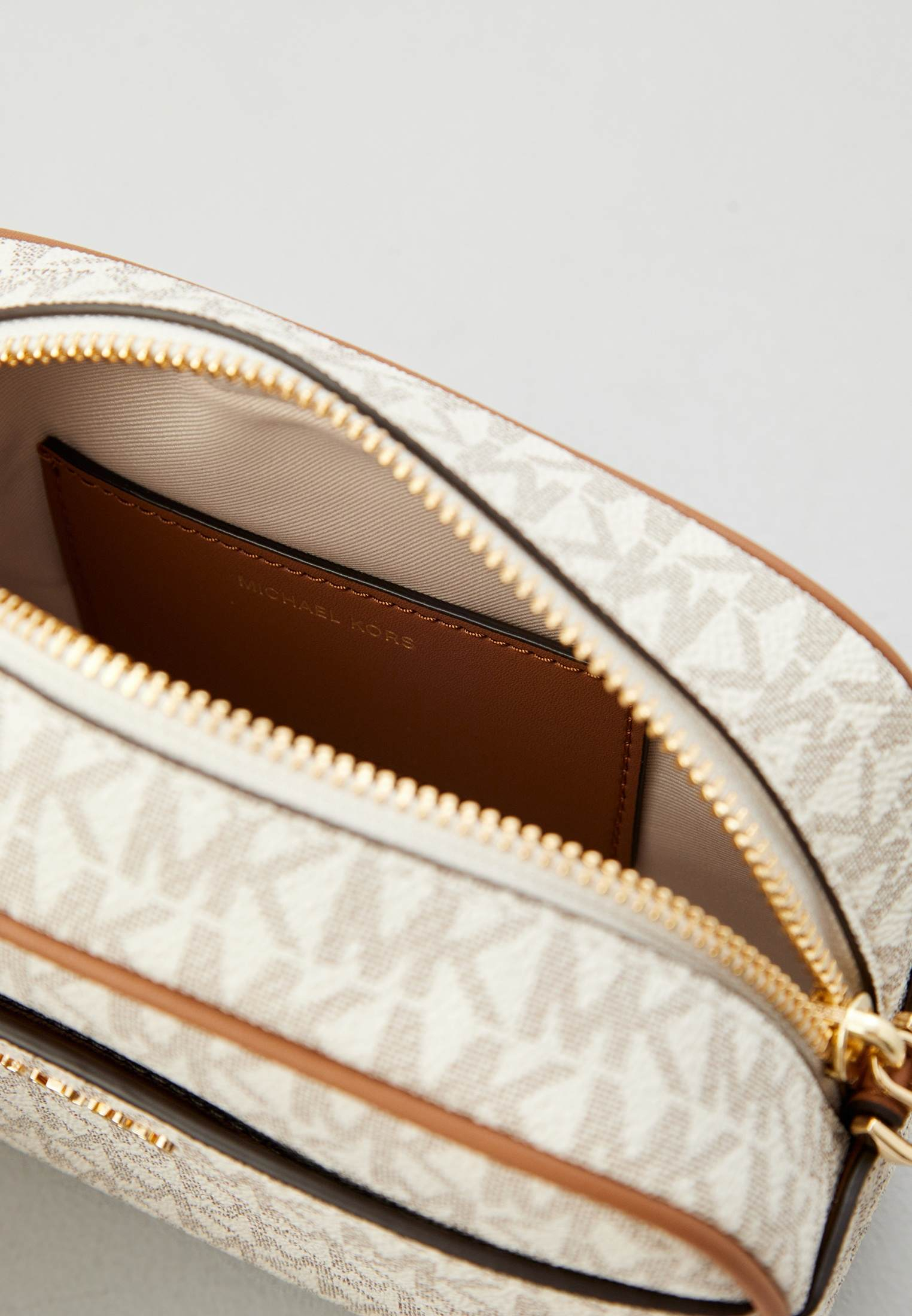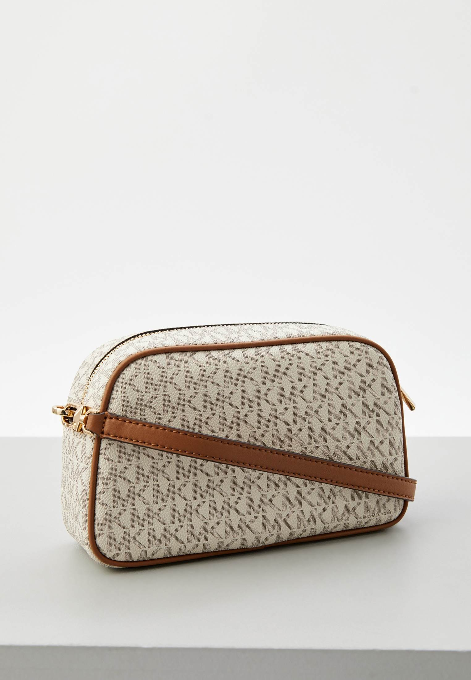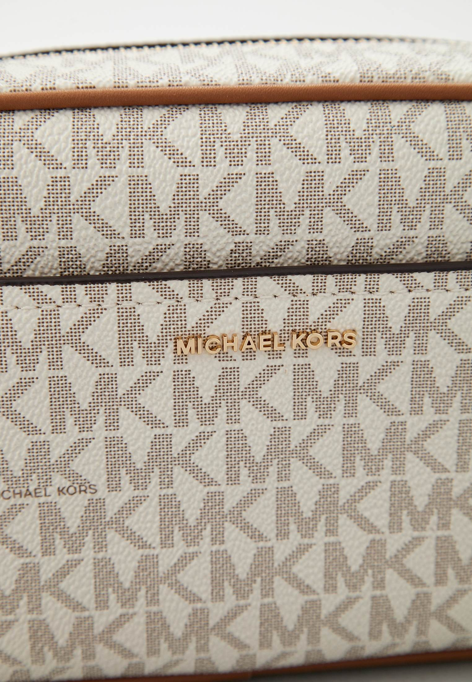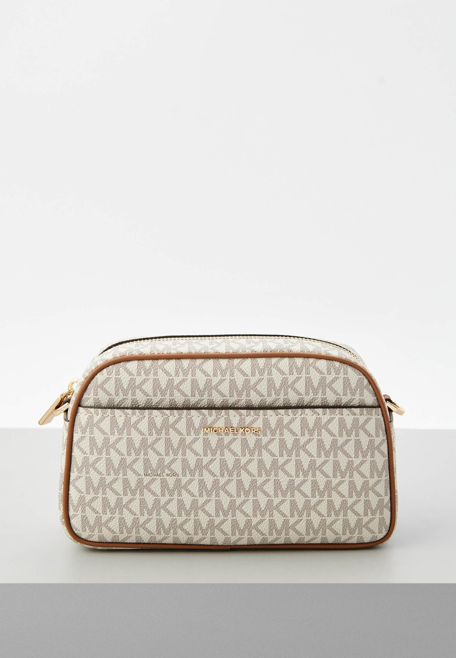 - Классический вариант сумки camera bag от Michael Kors — модель JET SET с жестким корпусом. Изделие выполнено из фактурной искусственной кожи с монограммой «MK» по всей поверхности. Сумка застегивается на молнию, имеет одно внутреннее отделение и съемный ремешок, позволяющий носить аксессуар на плече или через плечо. В оформлении модели использован фирменный золотистый логотип Michael Kors.