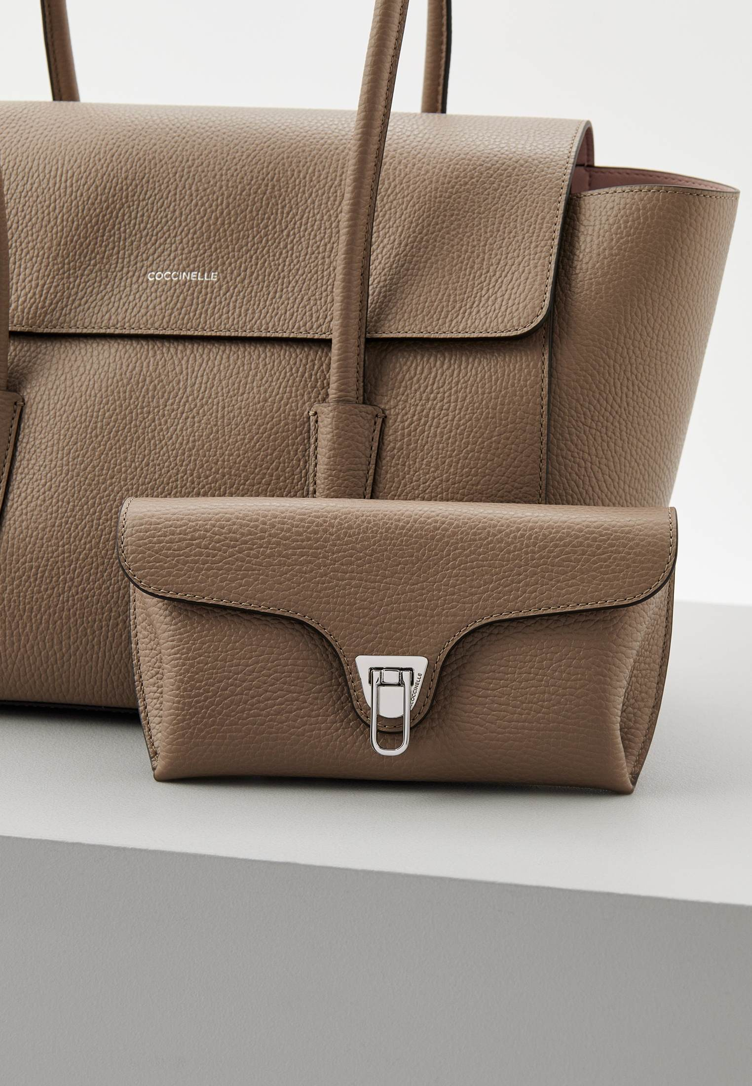 - Модель Coccinelle Double Beat — это новый взгляд на повседневную женскую сумку. Вместительная и удобная модель с клапаном и трубчатыми ручками дополнена съемным передним карманом, который легко превращается в клатч или сумочку-портмоне. Вы можете дополнять этим элементом свои вечерние или праздничные образы. Изделие выполнено из натуральной зернистой кожи, прошедшей специальную обработку для сохранения мягкости. Это прочный материал, устойчивый к выцветанию и мелким механическим повреждениям. Сумка имеет одно просторное отделение с внутренним карманом на молнии, застегивается на магниты. В неё поместятся ноутбук, планшет, документы формата А4, книги и ваши необходимые мелочи, которые всегда должны быть под рукой. Аксессуар оформлен фирменным логотипом бренда.