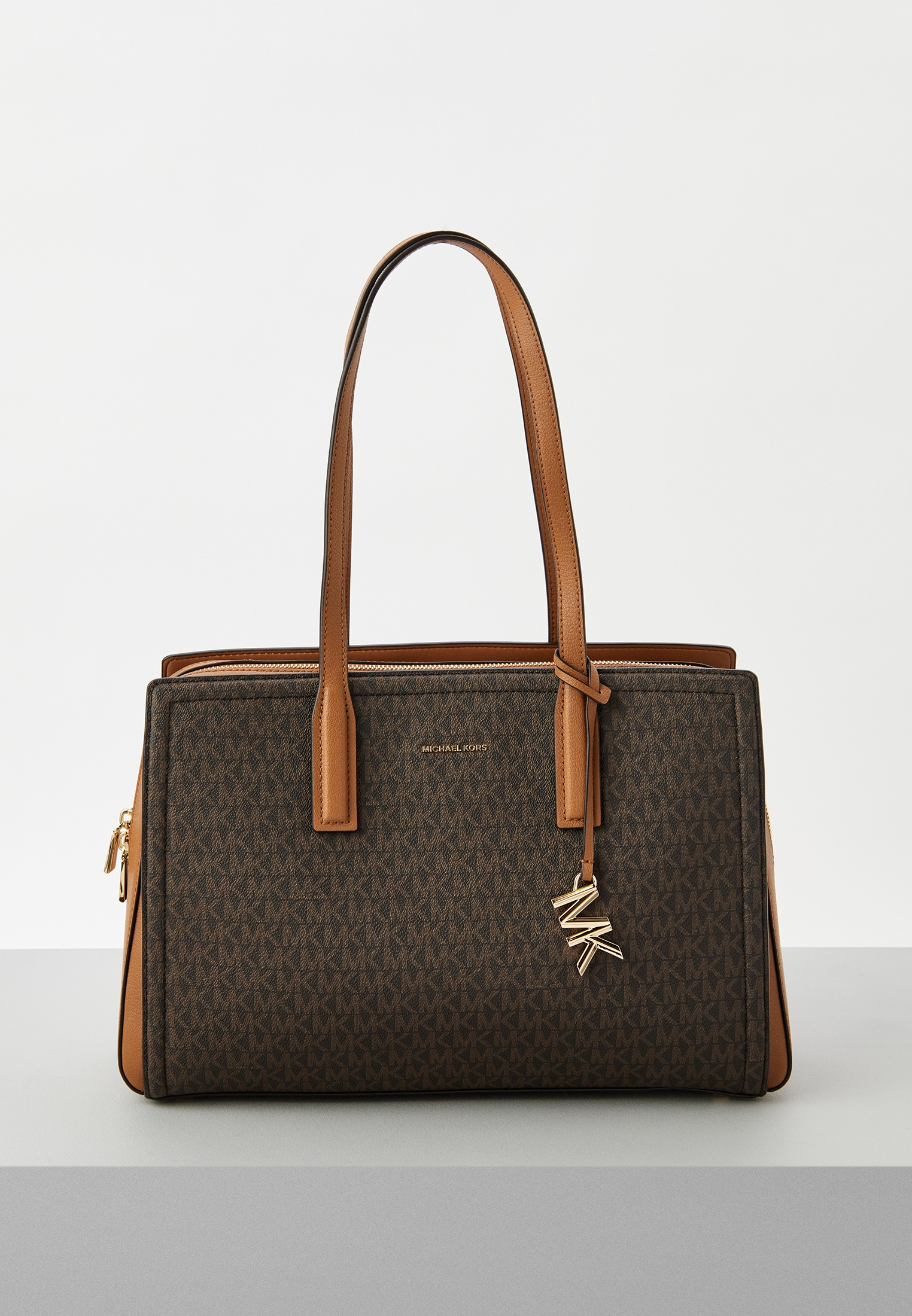 - Модель Laila в коричневом цвете, выполненная из искусственной фактурной кожи с тотал-принтом "MK", станет идеальным спутником в ваших повседневных образах. Универсальный силуэт и большой размер сумки позволяют носить все самые необходимые вещи, а три внутренних отделения на магните и молнии делают изделие максимально удобным и функциональным вариантом для современной женщины. Носите модель на плече с помощью удобных ручек. В оформлении сумки использован фирменный логотип бренда и лаконичный золотистый брелок.