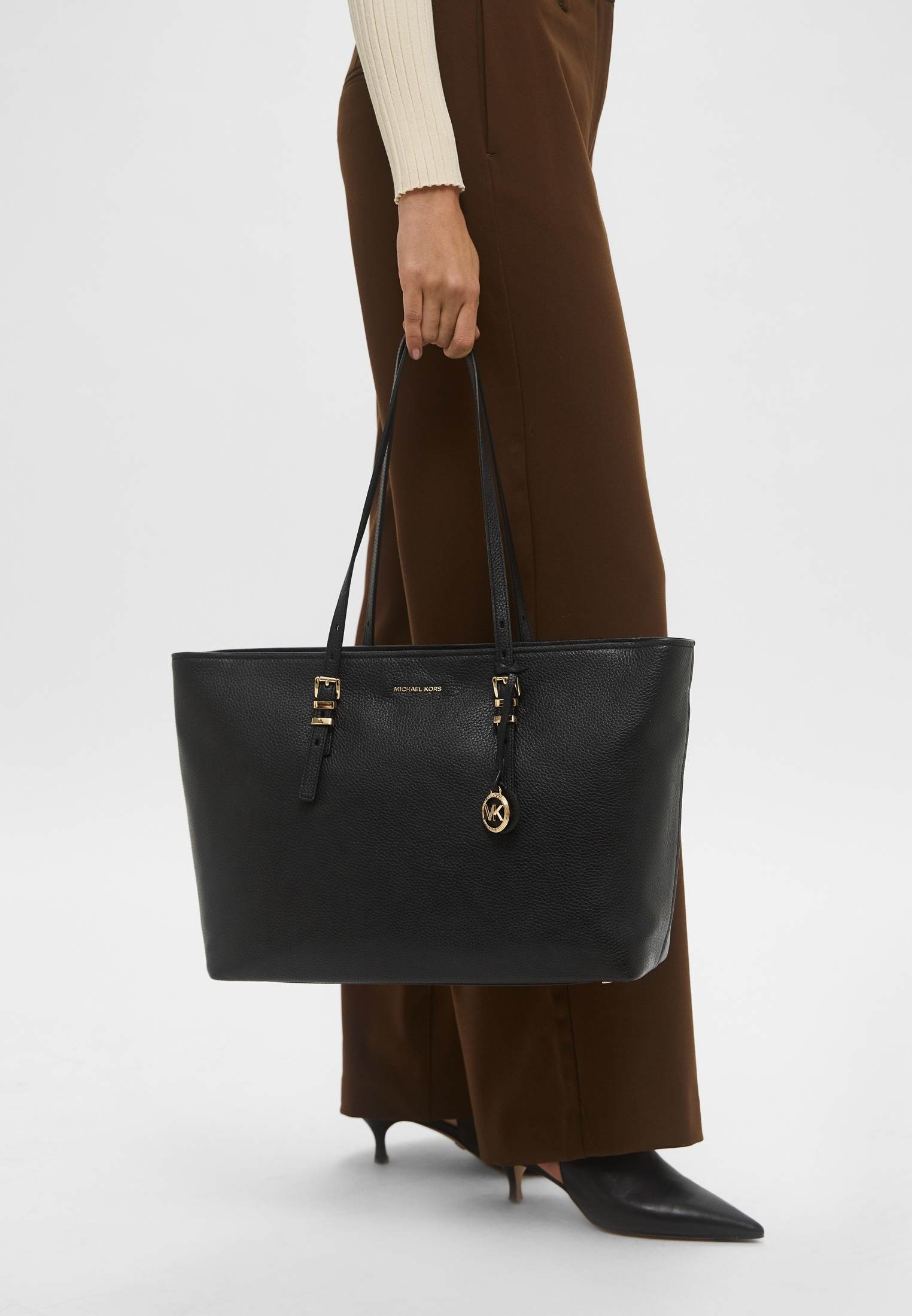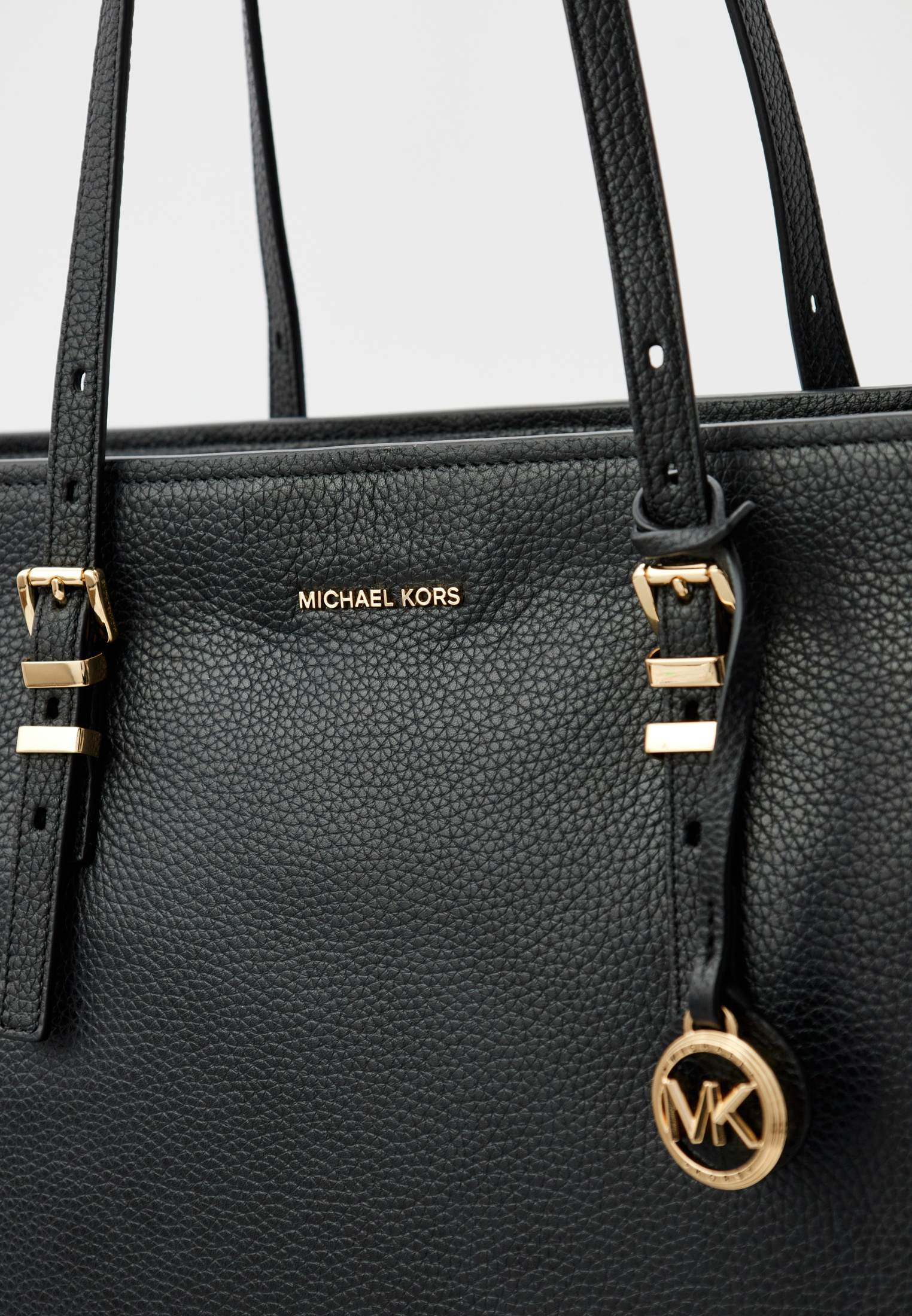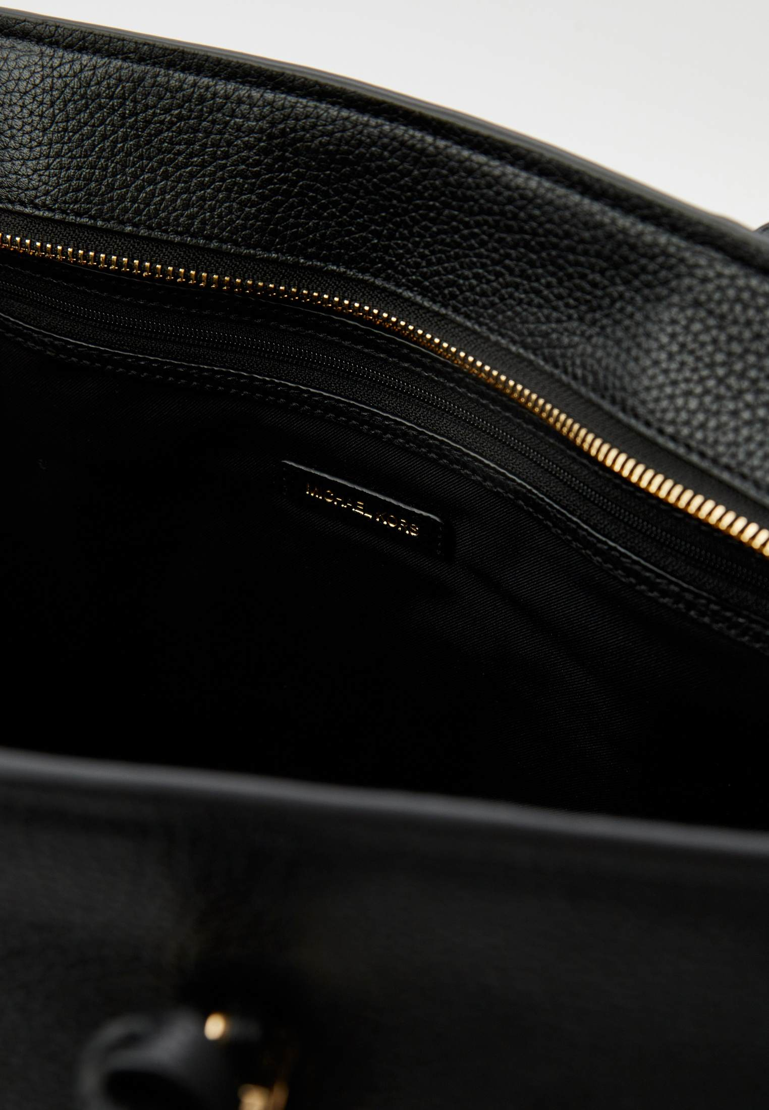 - Функциональная, вместительная и удобная — черная сумка Quinn от Michael Kors прекрасно подойдет для тех дней, когда нужно успеть все! Модель выполнена из натуральной зернистой кожи. Материал мягок, приятен на ощупь, достаточно прочен и пластичен. Сумка имеет две удобные регулируемые ручки и одно вместительное отделение, куда может поместиться ноутбук, планшет, тетради, книги и другие крупные вещи. Аксессуар застегивается на молнию. Модель украшена фирменным логотипом бренда и золотистым брелоком.