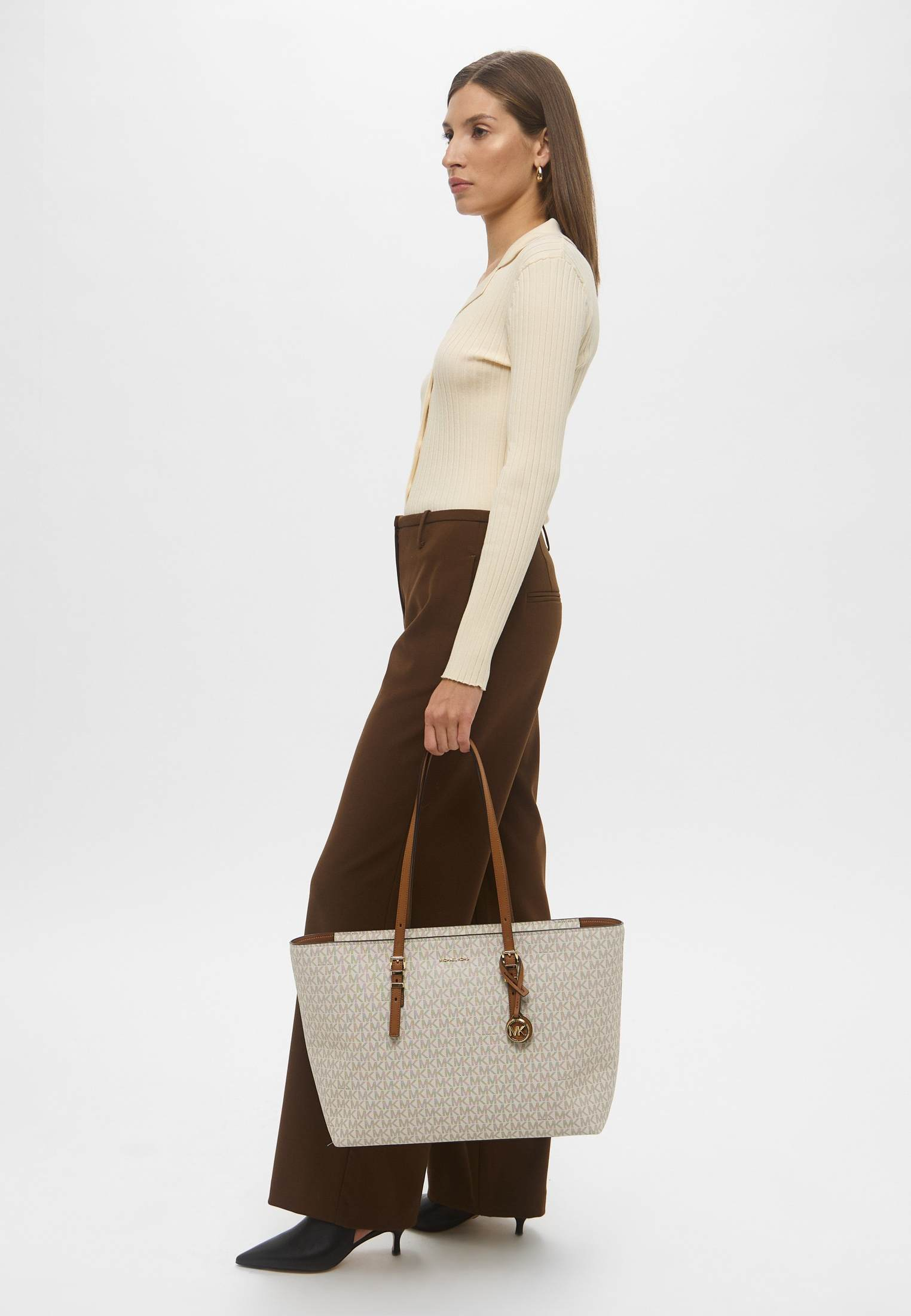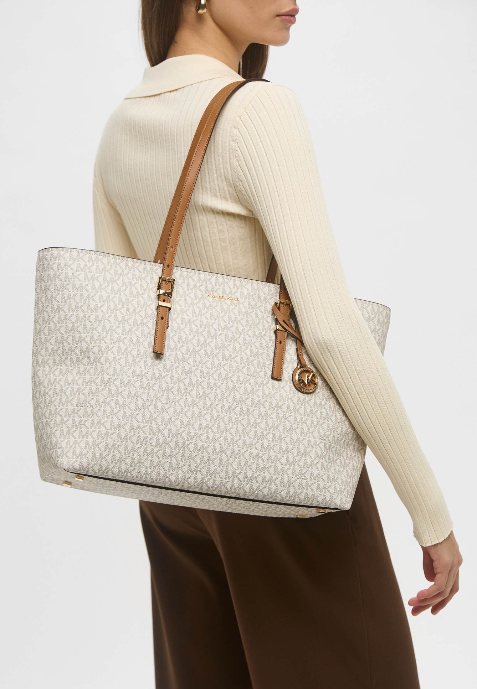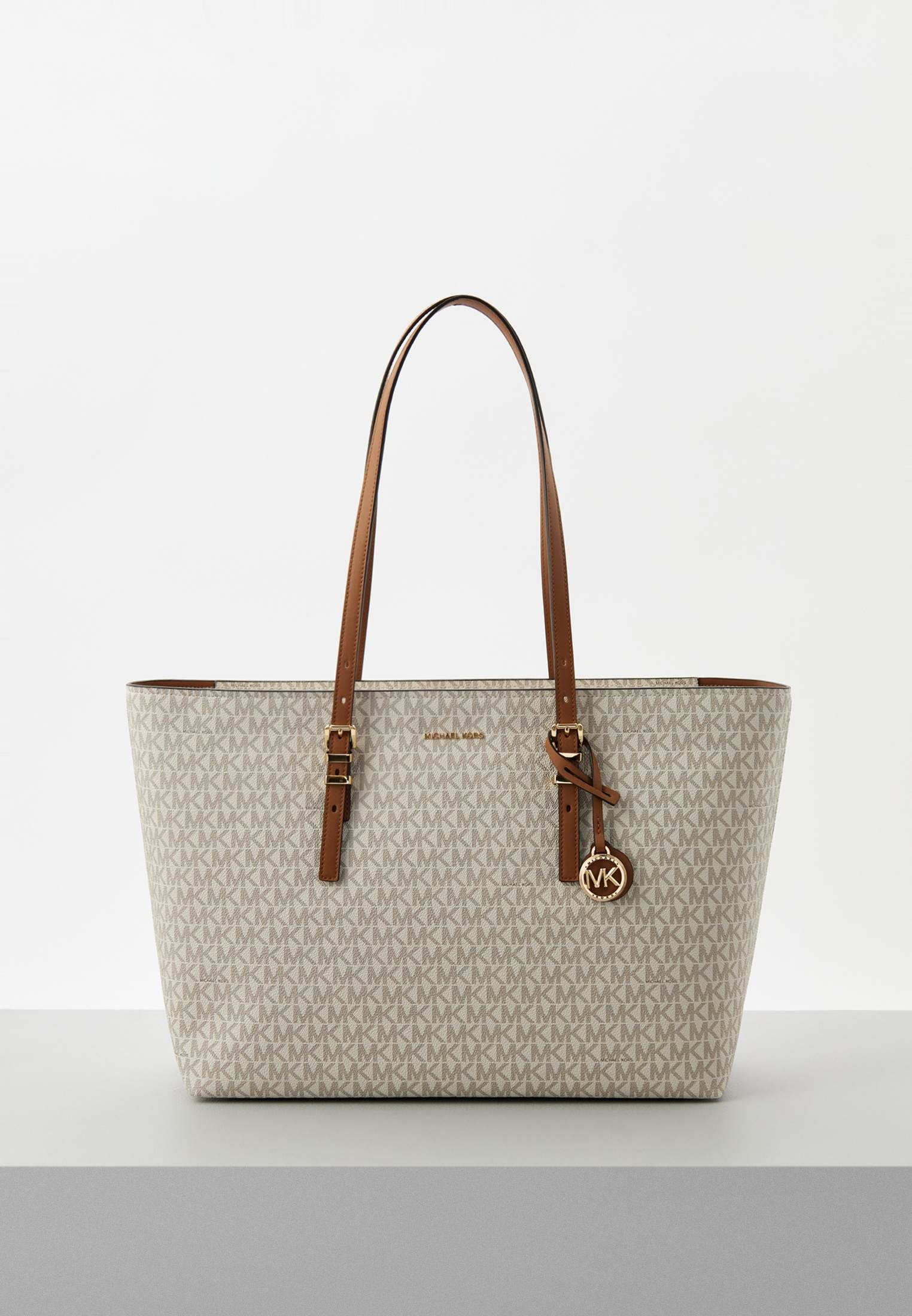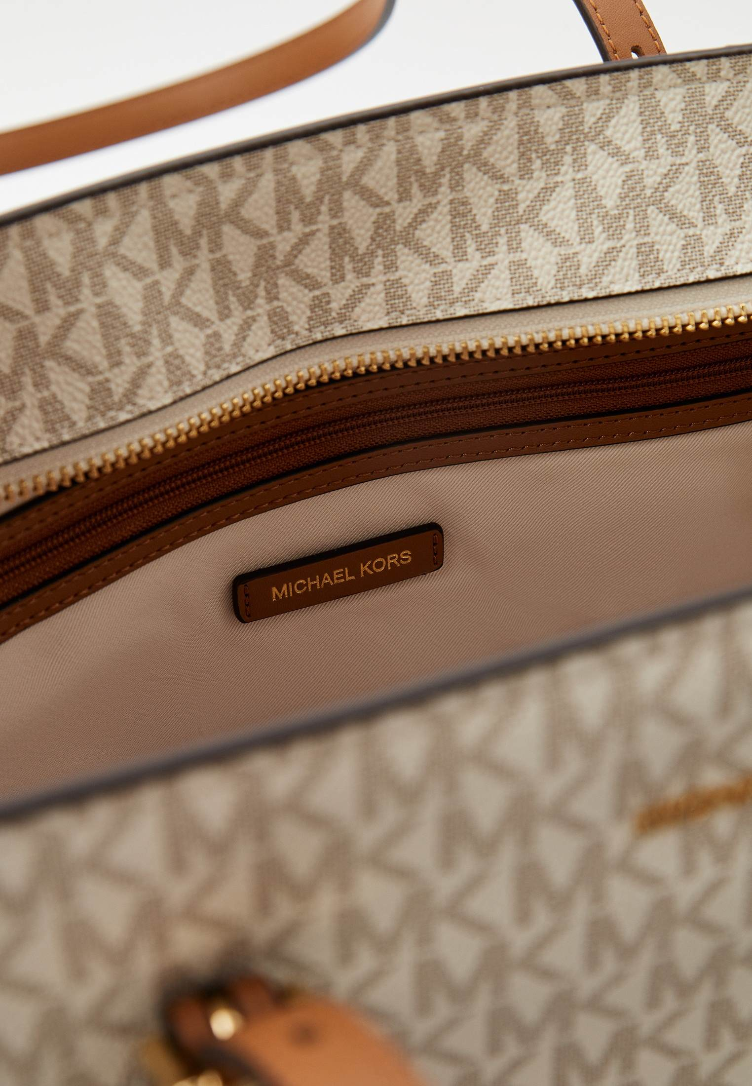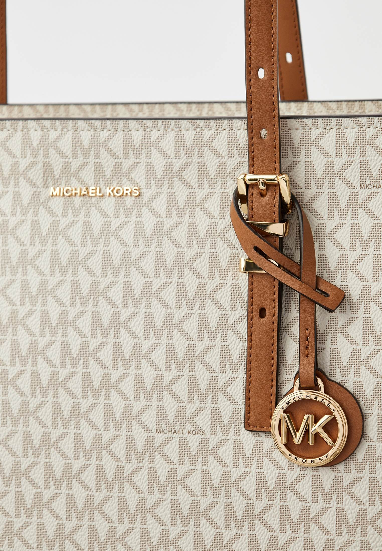 - Функциональная, вместительная и удобная — ванильная сумка Quinn от Michael Kors прекрасно подойдет для тех дней, когда нужно успеть все! Модель выполнена из искусственной зернистой кожи с классическим тотал-принтом «MK» по всей поверхности изделия. Материал мягок, приятен на ощупь, достаточно прочен и пластичен. Сумка имеет две удобные ручки и одно вместительное отделение, куда может поместиться ноутбук, планшет, тетради, книги и другие крупные вещи. Аксессуар застегивается на молнию. Модель украшена фирменным логотипом бренда и золотистым брелоком.