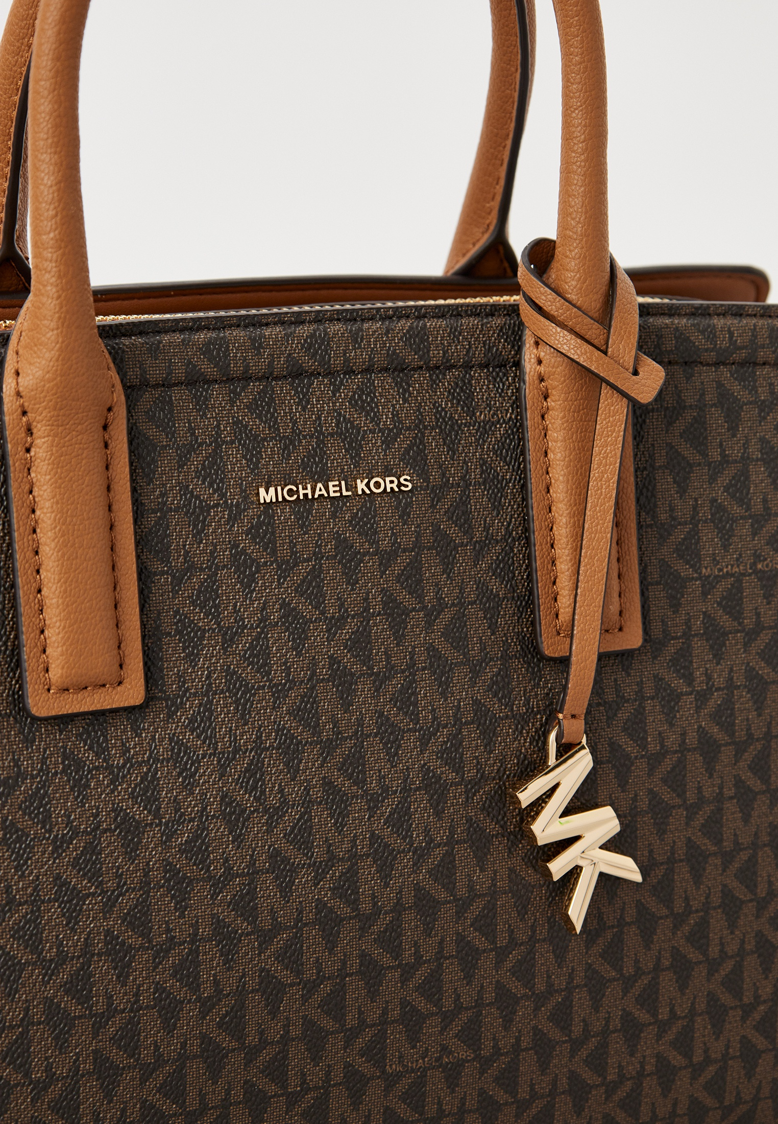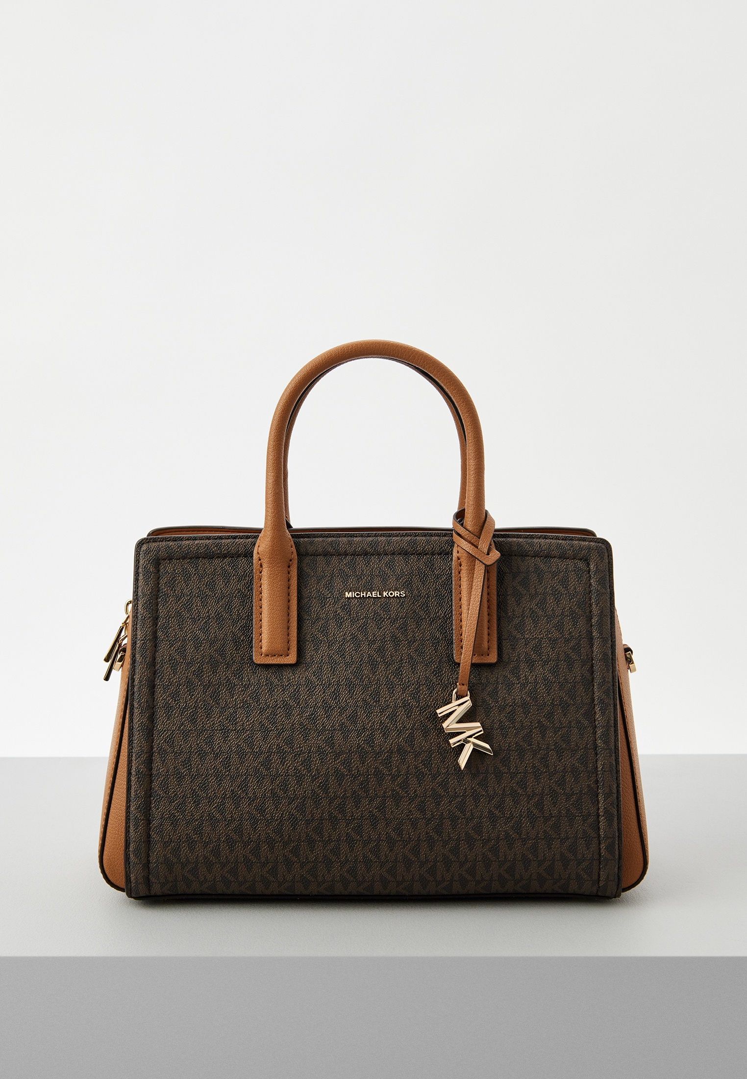 - Модель Laila в коричневом цвете, выполненная из искусственной фактурной кожи с тотал-принтом "MK", станет идеальным спутником в ваших повседневных образах. Универсальный силуэт и размер сумки позволяют носить все самые необходимые вещи, а три внутренних отделения на магните и молнии делают изделие максимально удобным и функциональным вариантом для современной женщины. Носите модель за ручки или на съемном регулируемом ремне через плечо. В оформлении сумки использован фирменный логотип бренда и лаконичный брелок.