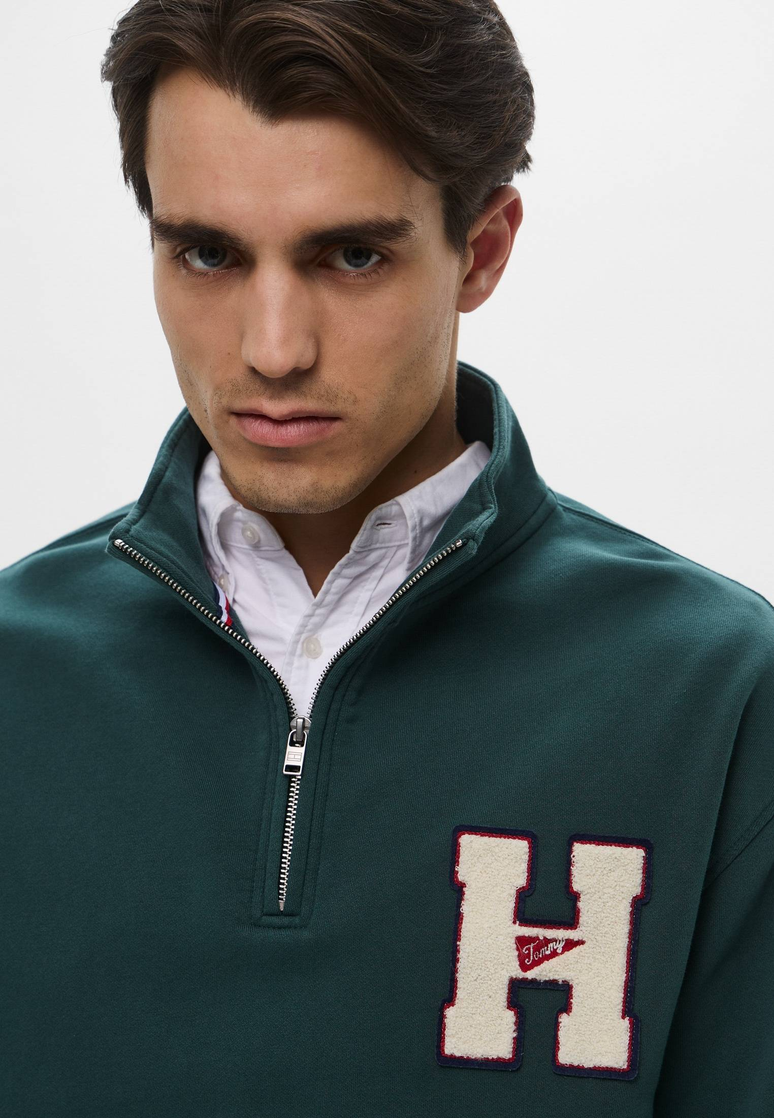 - Темно-зеленый свитшот в колледж-стиле — стильный элемент гардероба, легко адаптирующийся под любую стилизацию и ситуацию! Модель свободного кроя с воротником на молнии выполнена из хлопкового футера с мягкой петельчатой изнанкой. Материал отлично держит форму, обладает хорошей воздухопроницаемостью и согревает в холодную погоду. Передняя часть свитшота оформлена фирменным логотипом Tommy Hilfiger. Сочетайте модель с джинсами и брюками любого кроя, надевайте поверх рубашек или футболок. Дополните образ любимыми аксессуарами — универсальный аутфит для любого случая готов!