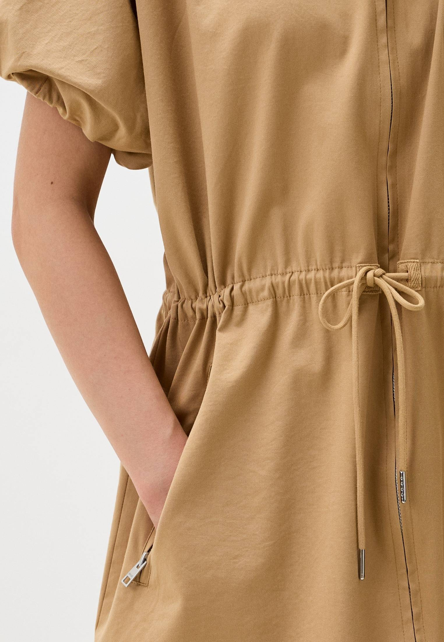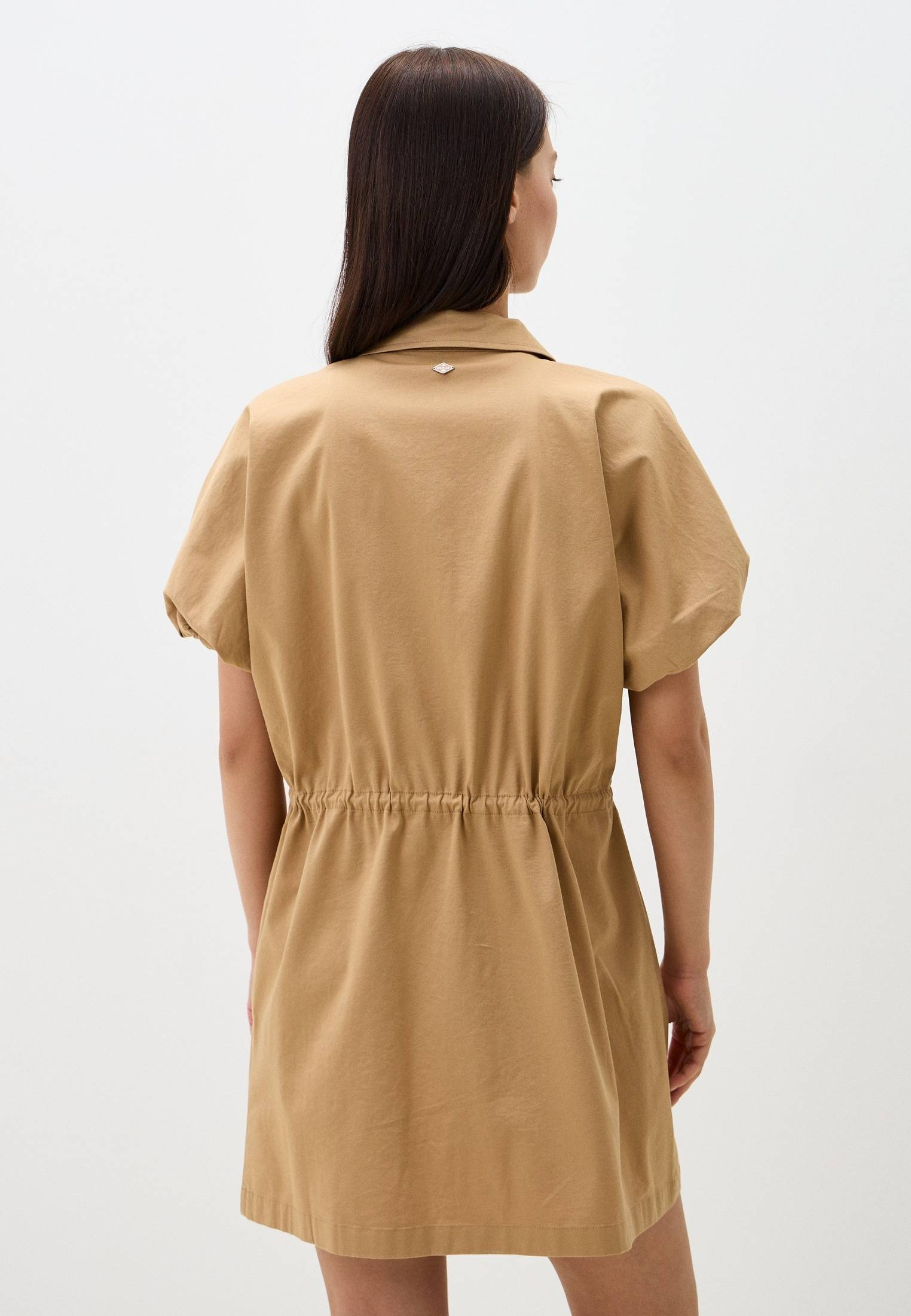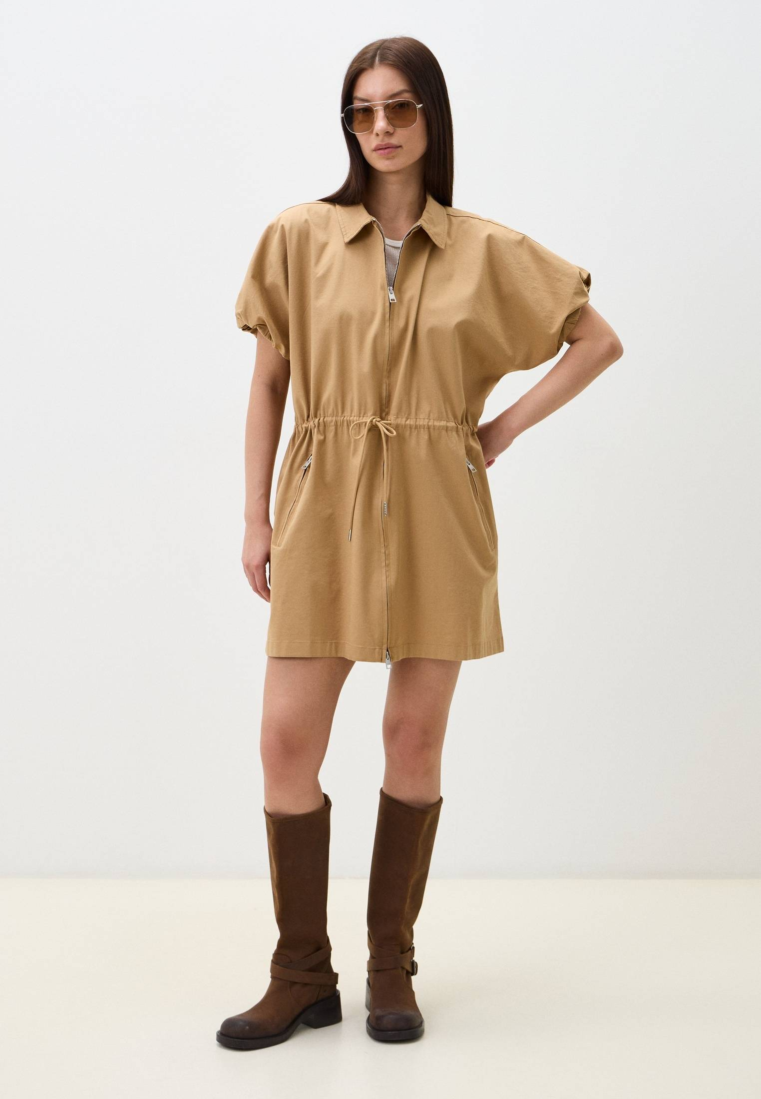 - Бежевое платье с объемными короткими рукавами от Replay — интересный вариант, который освежит ваши повседневные образы. Модель рубашечного свободного кроя выполнена из плотного текстиля с высоким содержанием хлопка. Модель имеет функциональные карманы на молнии по бокам, эластичные манжеты на рукавах и дополнительную утяжку на поясе, которая позволит подчеркнуть талию. Платье застегивается на молнию. На спине расположена небольшая металлическая табличка с логотипом бренда. Вы можете носите модель как тунику или платье, сочетая её с обувью на каблуке или плоской подошве.