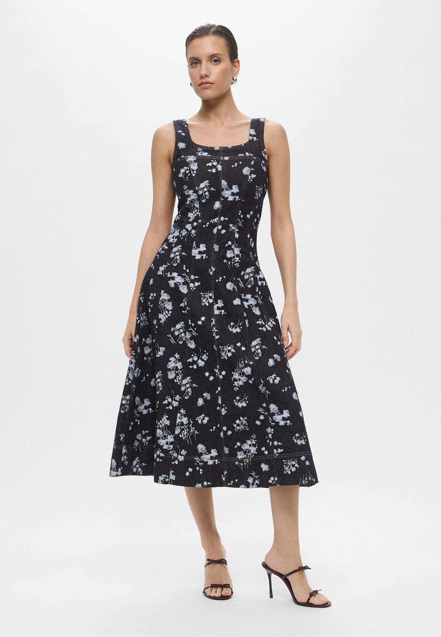 - Летнее и женственное — расклешенное синее платье с цветочным принтом от Karl Lagerfeld. Модель длины миди выполнена из легкого хлопкового денима. Платье застегивается на молнию, расположенную на спине. Сочетайте изделие с босоножками, элегантными туфлями или обувью на плоской подошве, представленной в ассортименте BNS Club.
