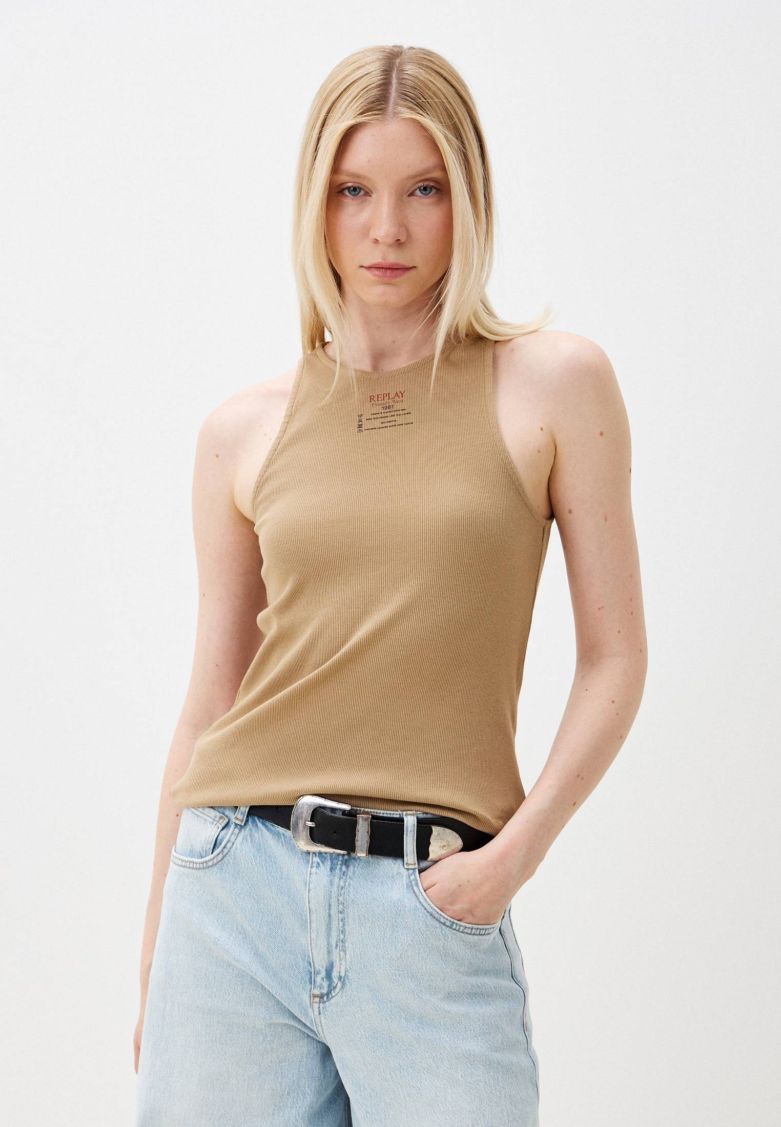 - Облегающая бежевая майка Replay станет прекрасной базой под пиджак и брюки или стильным дополнением к широким джинсам и кедам. Модель выполнена из эластичного трикотажа в рубчик на основе дышащего хлопка. Материал мягко облегает фигуру, подчеркивая её изгибы. Передняя часть майки оформлена минималистичным принтом в стиле бренда.
