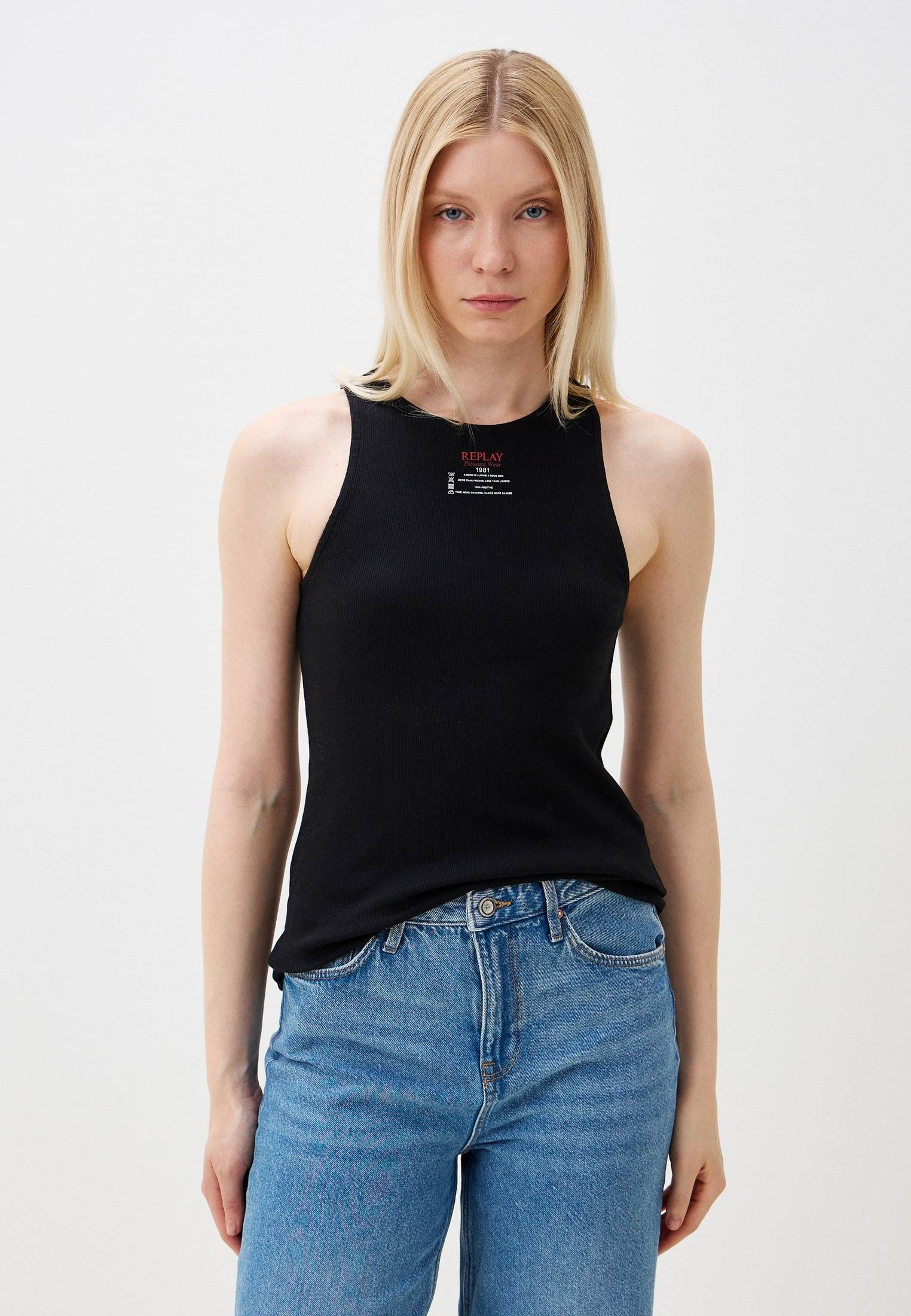 - Облегающая черная майка Replay станет прекрасной базой под пиджак и брюки или стильным дополнением к широким джинсам и кедам. Модель выполнена из эластичного трикотажа в рубчик на основе дышащего хлопка. Материал мягко облегает фигуру, подчеркивая её изгибы. Передняя часть майки оформлена минималистичным принтом в стиле бренда.